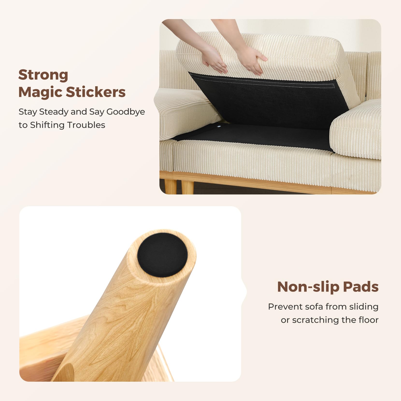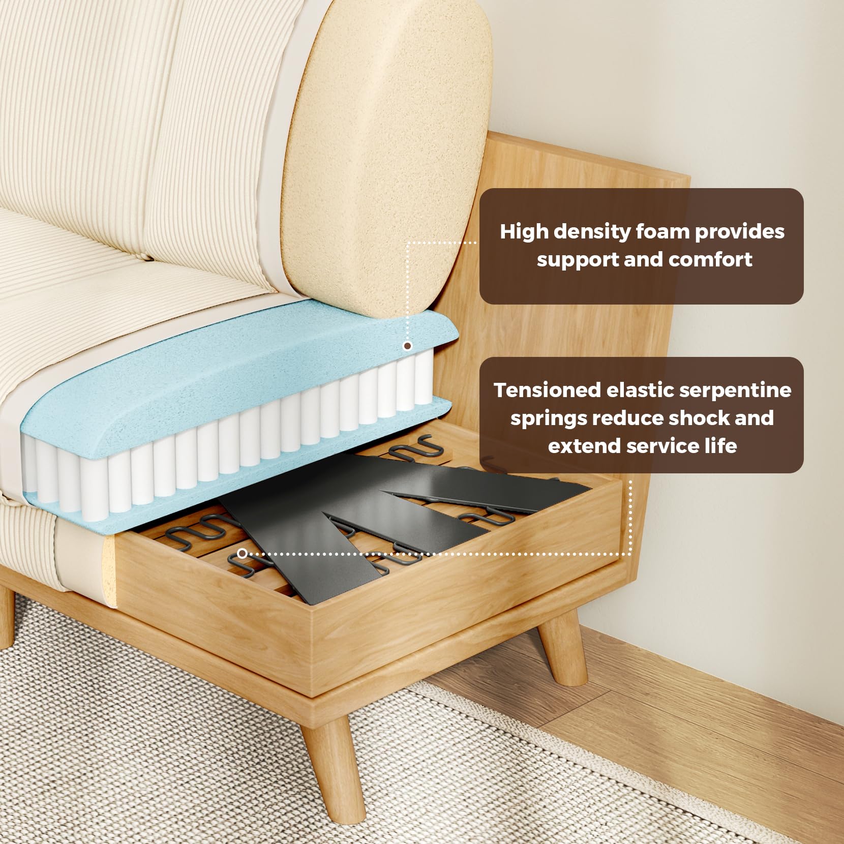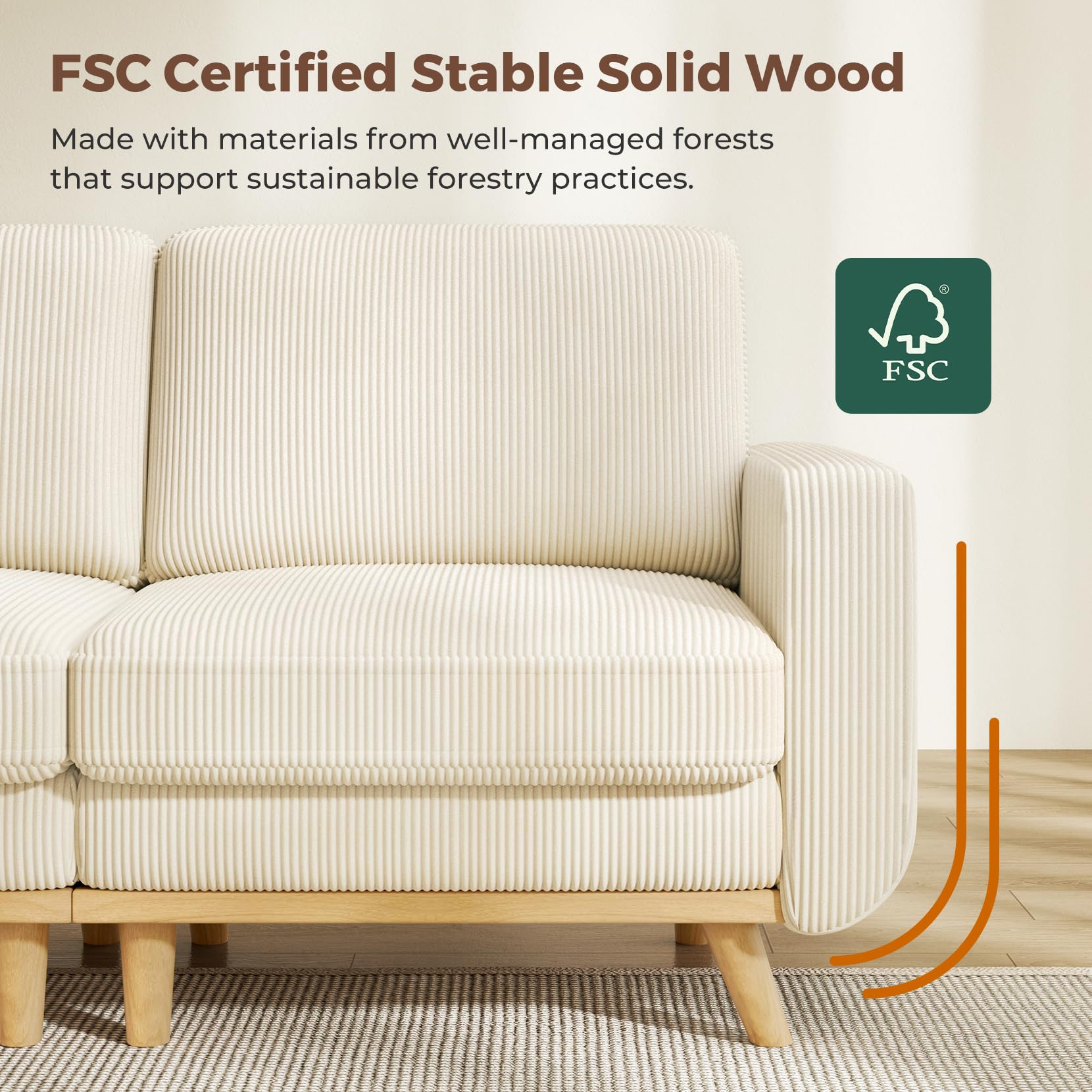 - FSC Certified Solid Wood - Made with materials from well-managed forests that support sustainable forestry practices. This modular sofa is known for its sturdiness and solidity, with a maximum weight capacity of 800 lbs. Additionally, the sofa couch features non-slip protective backing on the bottom of the legs, providing stability and preventing damage to flooring