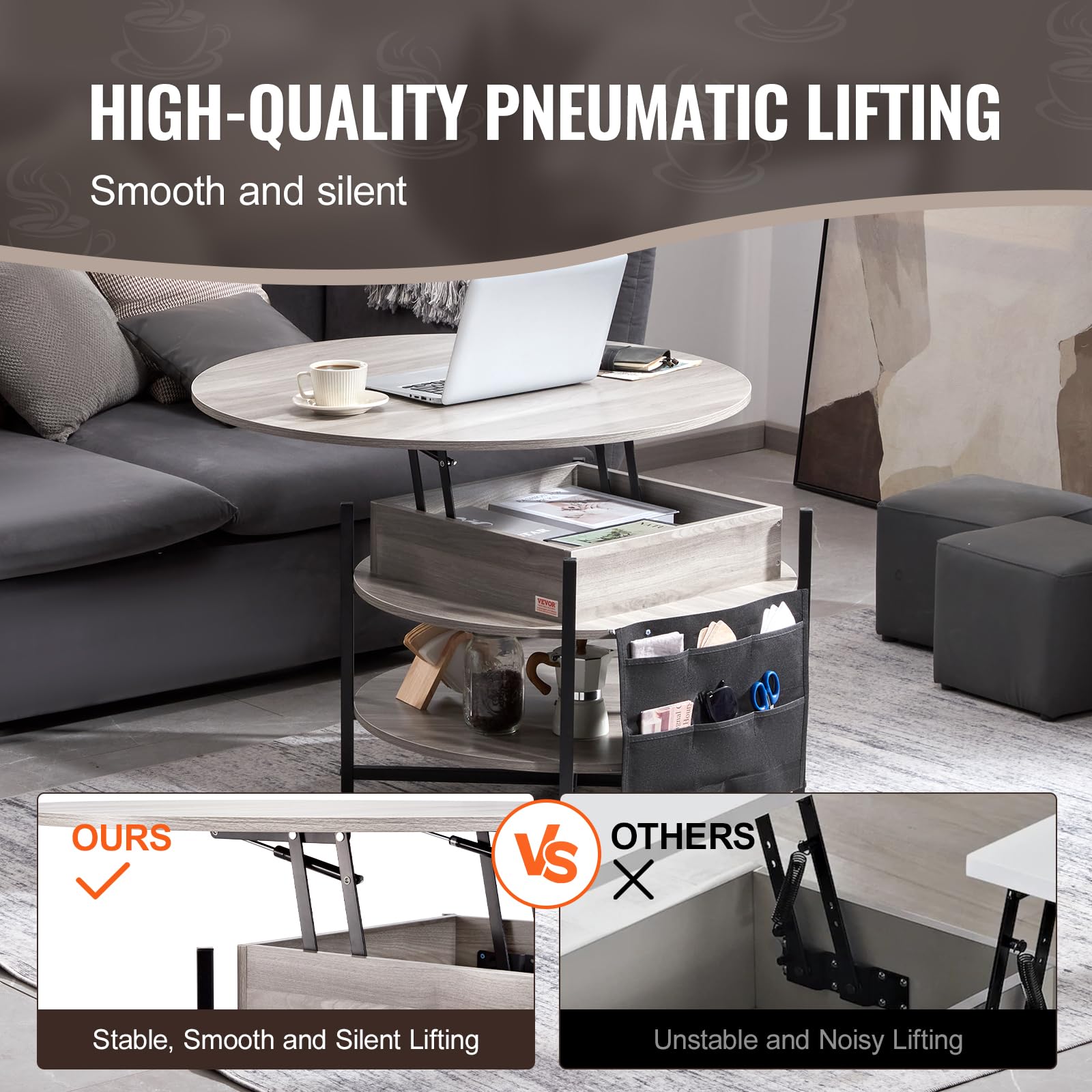- Pneumatic Lifting Mechanism: Constructed with a high-quality metal frame, the lift-top coffee table features a smooth, noise-free lifting mechanism for effortless tabletop adjustment. Made from premium particleboard, it remains stable and sturdy after proper assembly, offering a strong load-bearing capacity to handle daily use with ease.