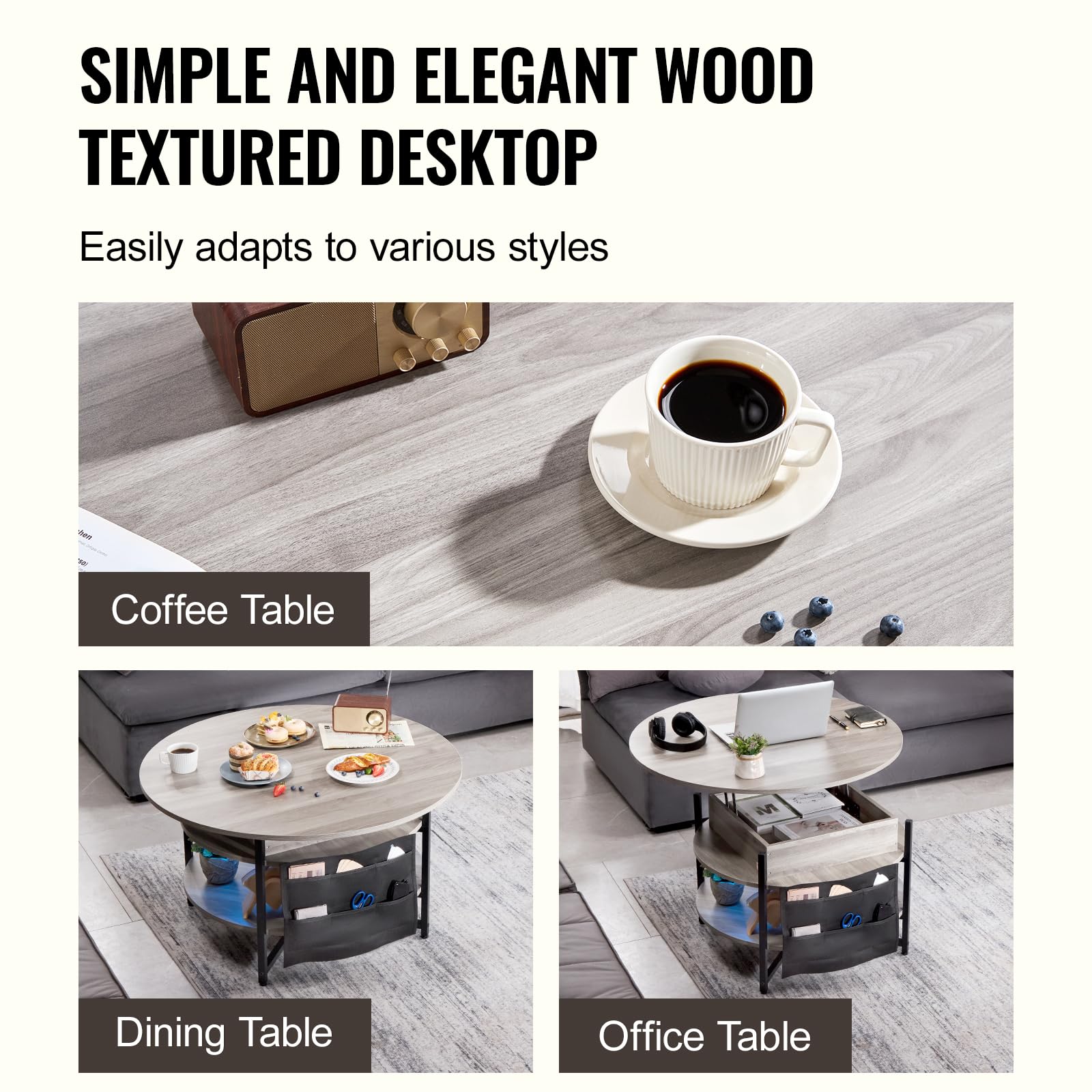 - Adjustable Height: This adjustable coffee table features an extendable top that can be raised, providing a floating raised work surface with two modes (normal and raised positions). It is designed for flexible use, convenient for working, dining, and storing living room items.