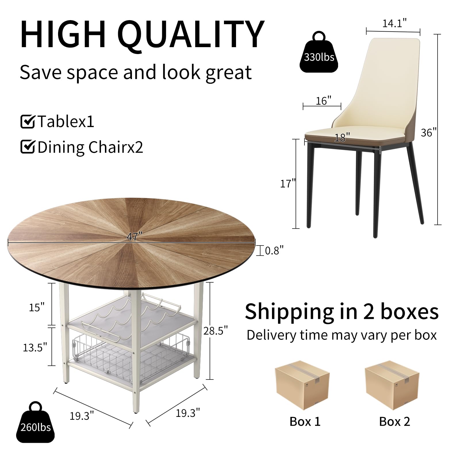 - 【Compact design for small spaces】:Dining table dimensions: 47'L x 29.3'H x 19.3'W; chair dimensions: 18'L x 16'W x 36'H, with load capacities of 250 lbs and 350 lbs respectively. The streamlined compact design makes it ideal for small dining areas such as apartments, kitchens, and living rooms, maximizing the use of limited space.