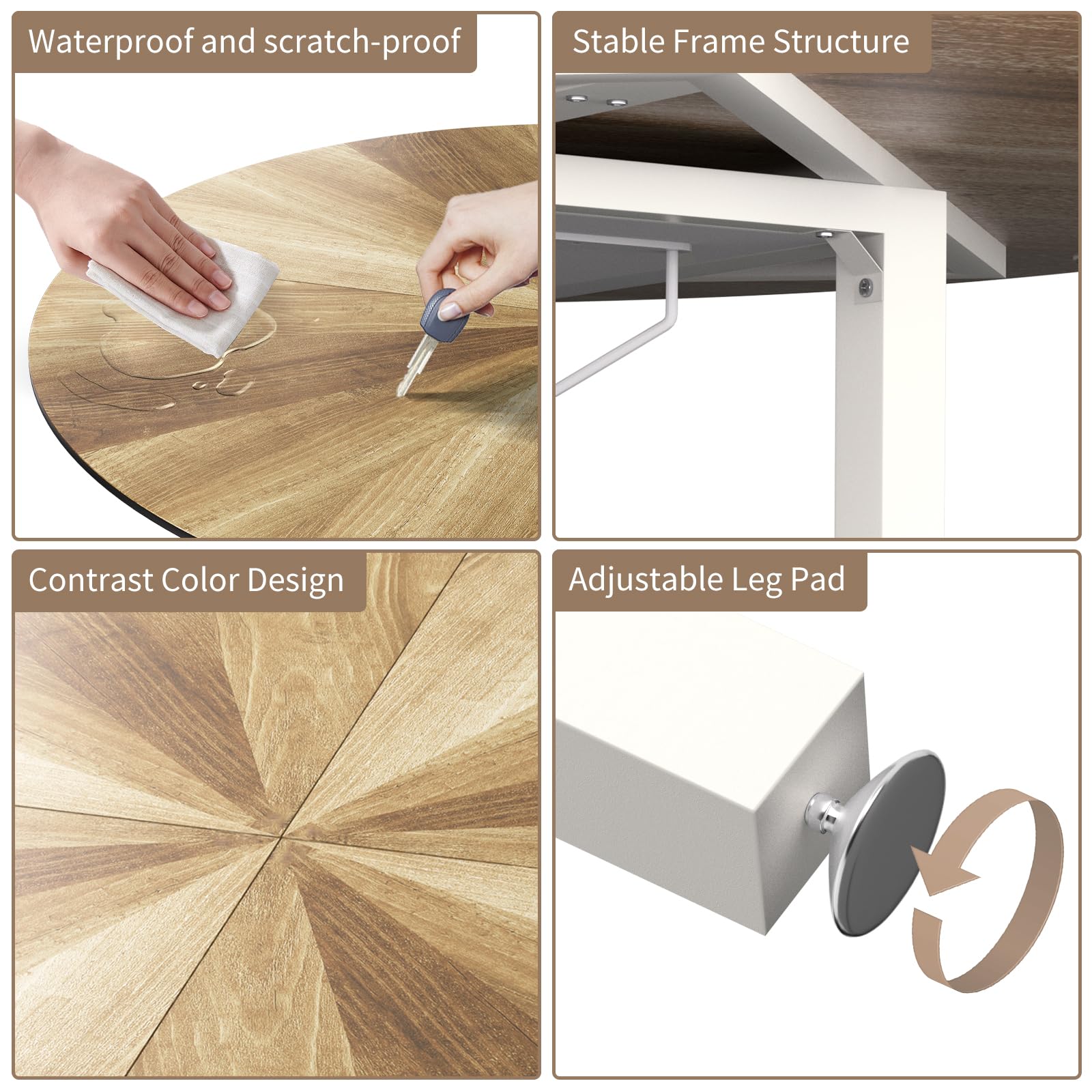 - 【47 Inch Sunburst Round Dining Table】:The dining table is made of high-quality medium-density fiberboard with patchwork pattern design, with a metal frame for strong support. There are two layers of storage racks under the table to increase storage space and help organize dining items. The spacious 47-inch tabletop maximizes the available area and is suitable for placing tableware, decorative plants and desserts. Four square table legs ensure stability, and the adjustable rubber pads at the bottom can protect the floor and keep the tabletop stable.