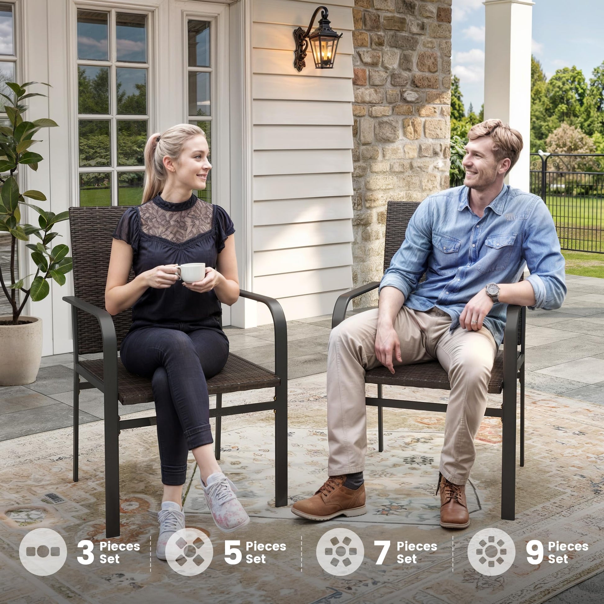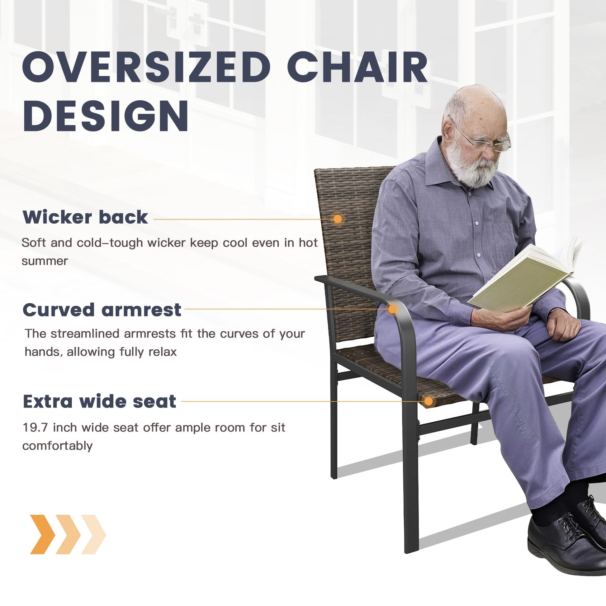 - Comfortable Rattan Seating: Ergonomically designed patio chairs with extra-large wide seat provide all-day comfort. Breathable rattan material prevents overheating in summer.