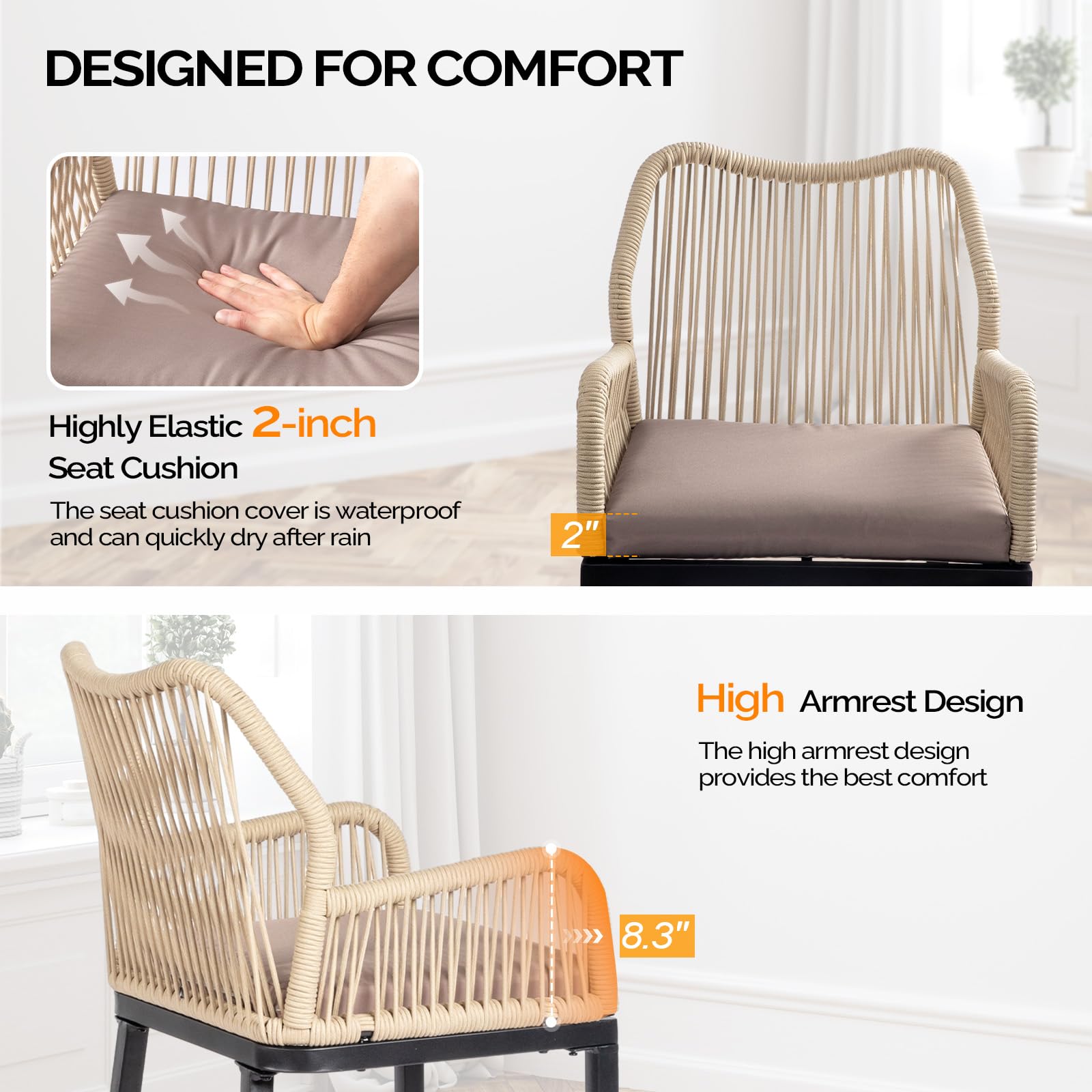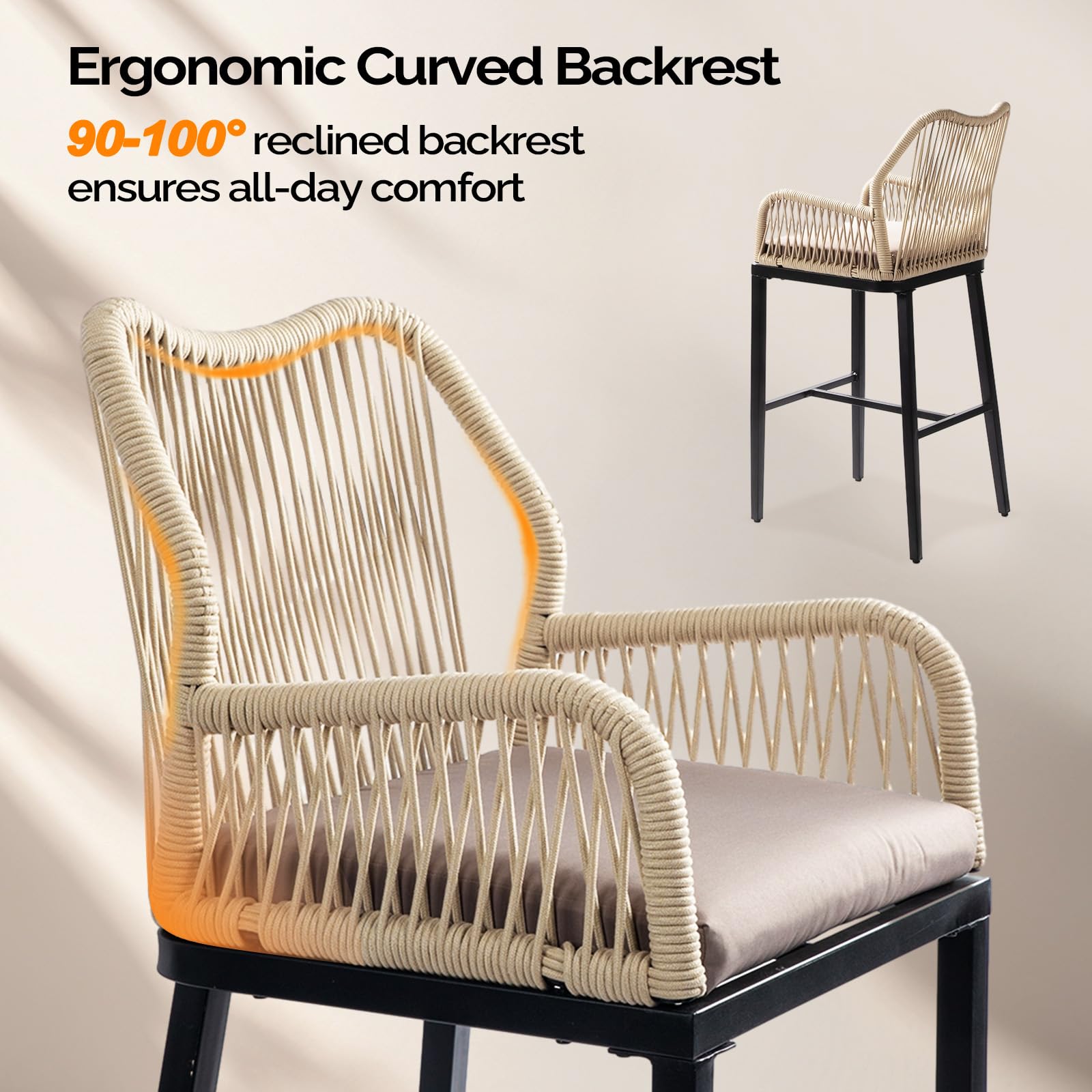 VINGLI Outdoor Bar Stools Set of 2, Heavy-Duty Outdoor Barstools Boho Woven Patio Bar Stools with Backrest, Patio Garden Balcony Pool Bar Chairs with Cushions (Apricot)