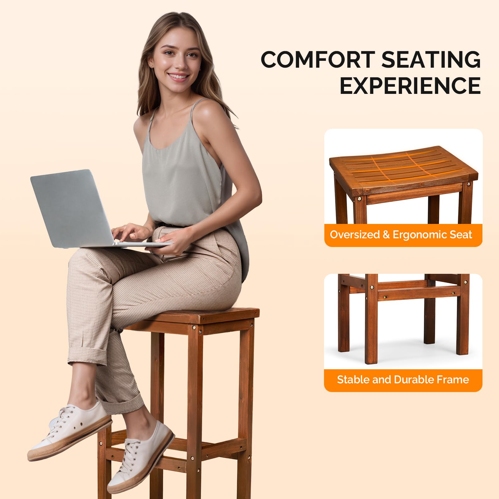 Details: This set of 2 outdoor solid wood bar stools combines natural aesthetics with functionality. The 17.72' wide curved seat offer superior comfort. Made from kiln-dried dense wood to prevent cracking, these 28.54'-height stools fit most standard counters. Perfect for morning coffee or evening gatherings in your patio, garden, or kitchen—blending rustic charm with everyday practicality.