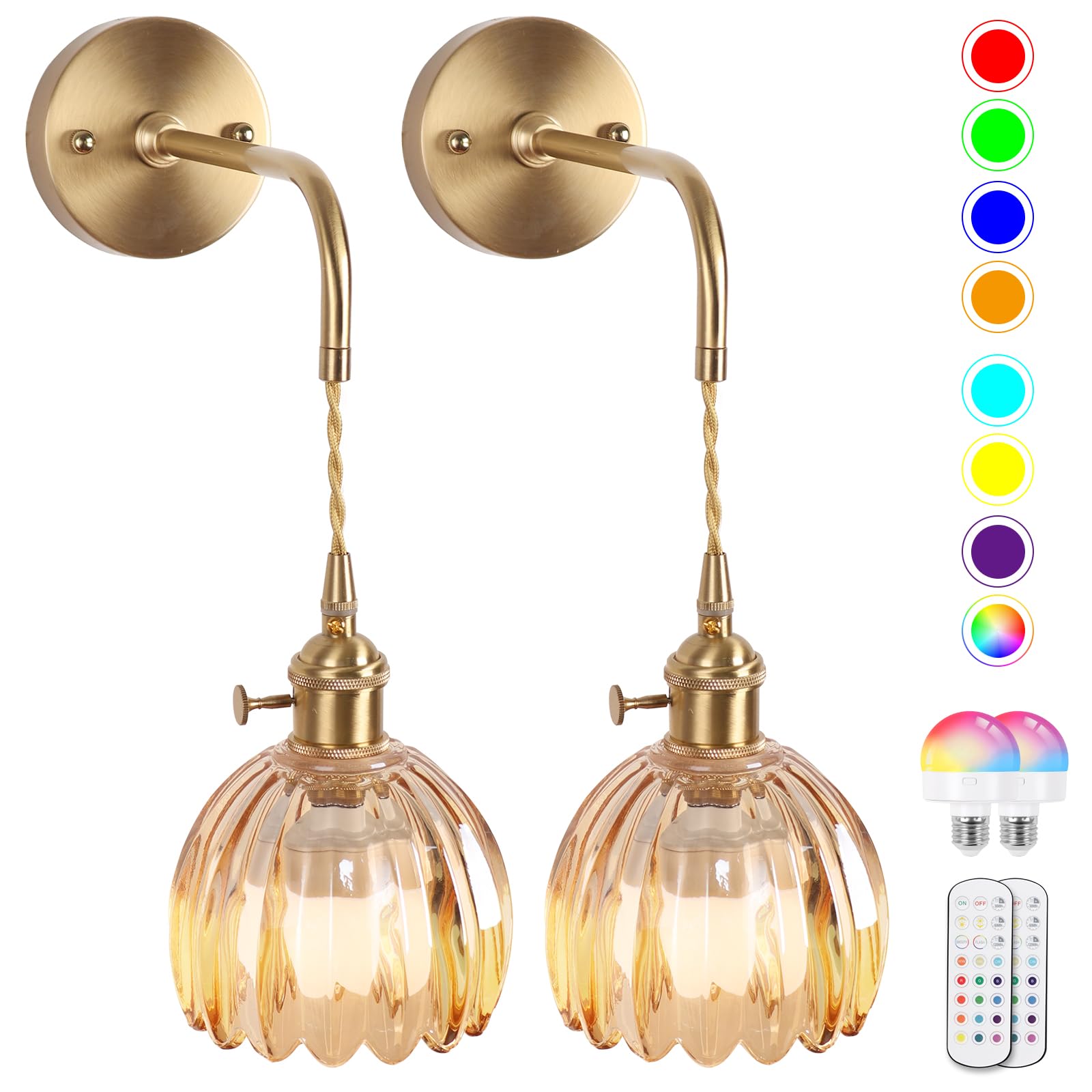 Vintage Battery Operated Wall Sconces Sets Of Two,Indoor not Hardwired Amber Tulip Glass Lampshade Fixtures,Rechargeable Wireless RGB Wall Lights with Dimmable Remote Control,for Bedroom Living Room