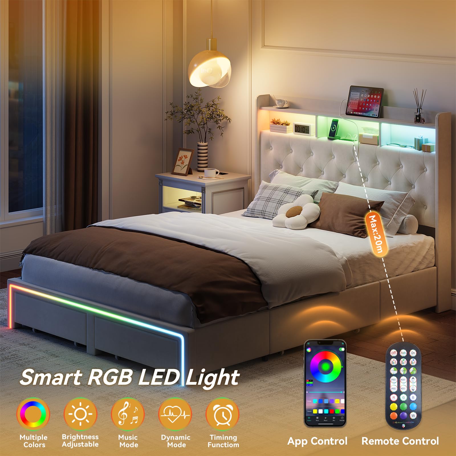 - Ambient RGB Lighting: Create the perfect atmosphere with built-in RGB LED lighting, seamlessly integrated into the bed frame. Customize colors, brightness, and lighting modes through the mobile app to match your mood or style. Whether relaxing, reading, or entertaining, set the vibe with vibrant, adjustable illumination