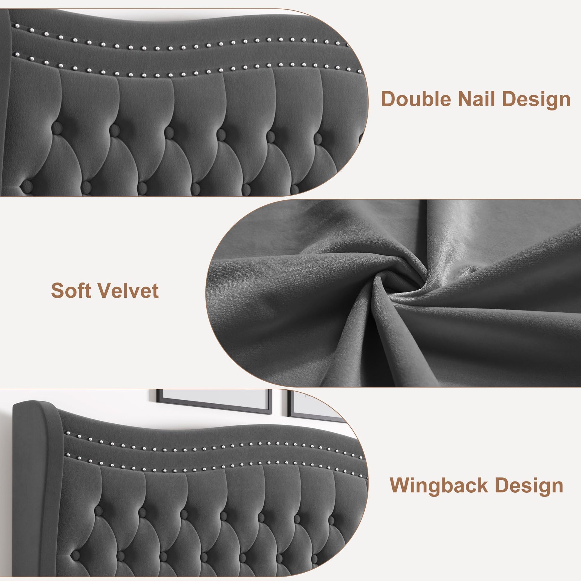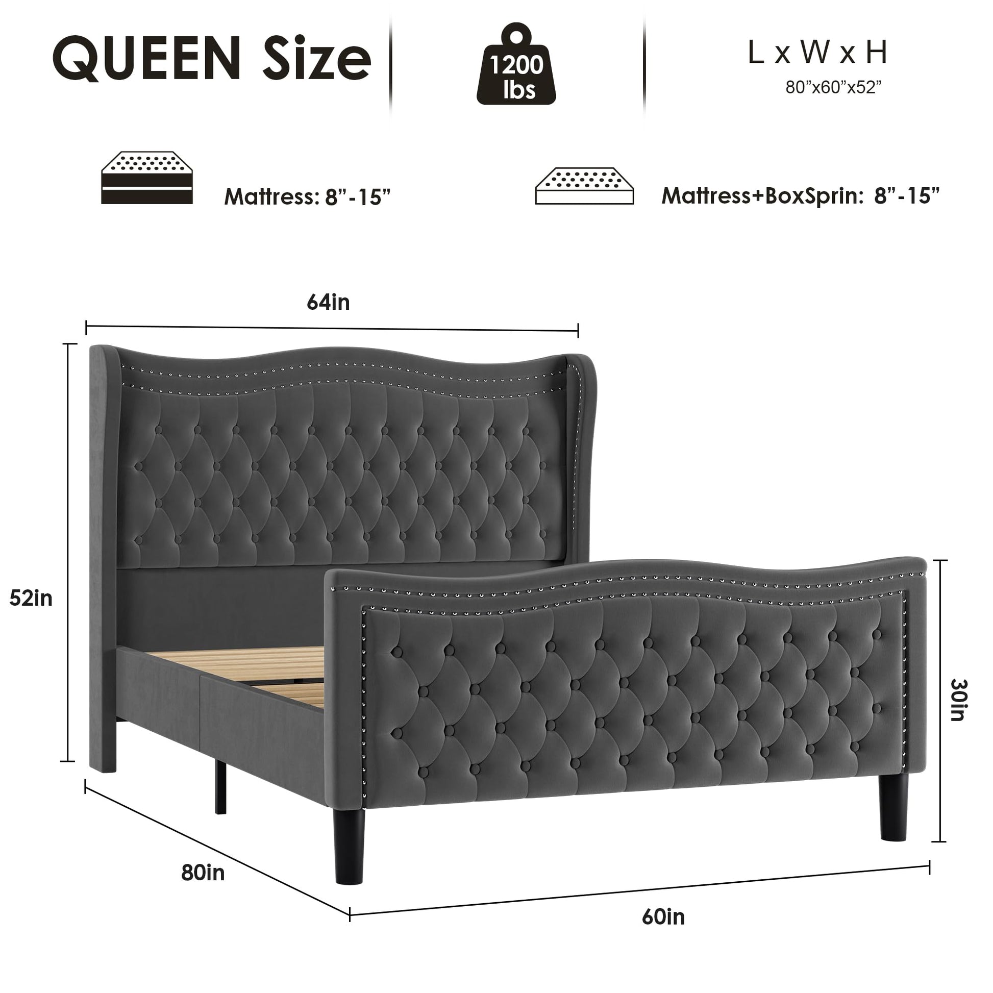 VINTLJUS Queen Bed Frame with Tall Headboard & Footboard, Velvet Upholstered Platform Bed Frame with Deep Button Tufted Wingback, No Box Spring Needed, Noise Free, Grey