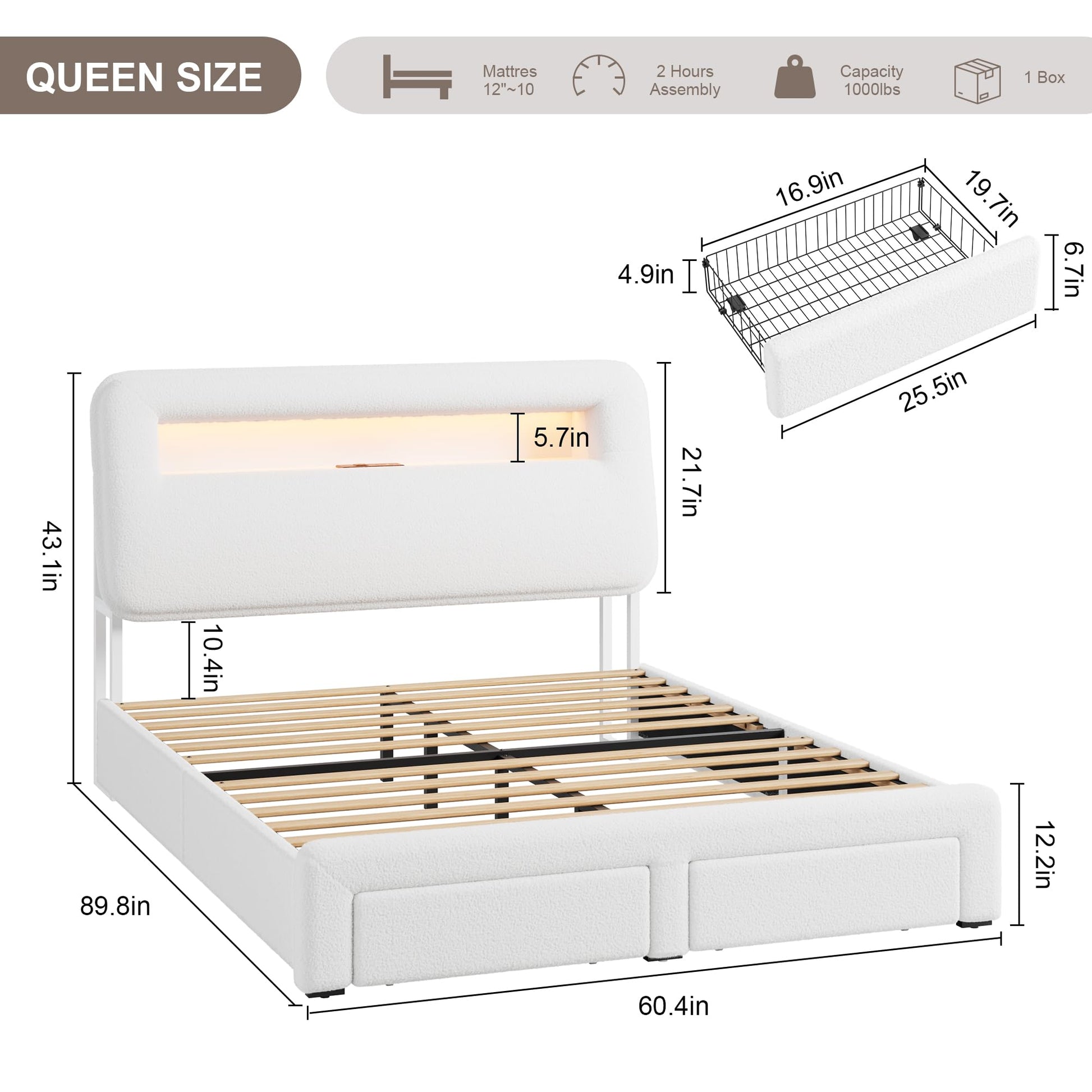 VINTLJUS Queen LED Bed Frame with Storage Headboard & Charging Station, Kids Bed Frames with Bookcase, Teddy Fleece Upholstered Platform Bed Frames with 2 Storage Drawers, No Box Spring Needed, Beige