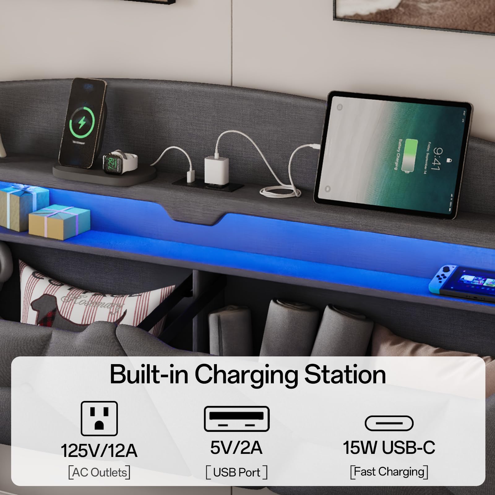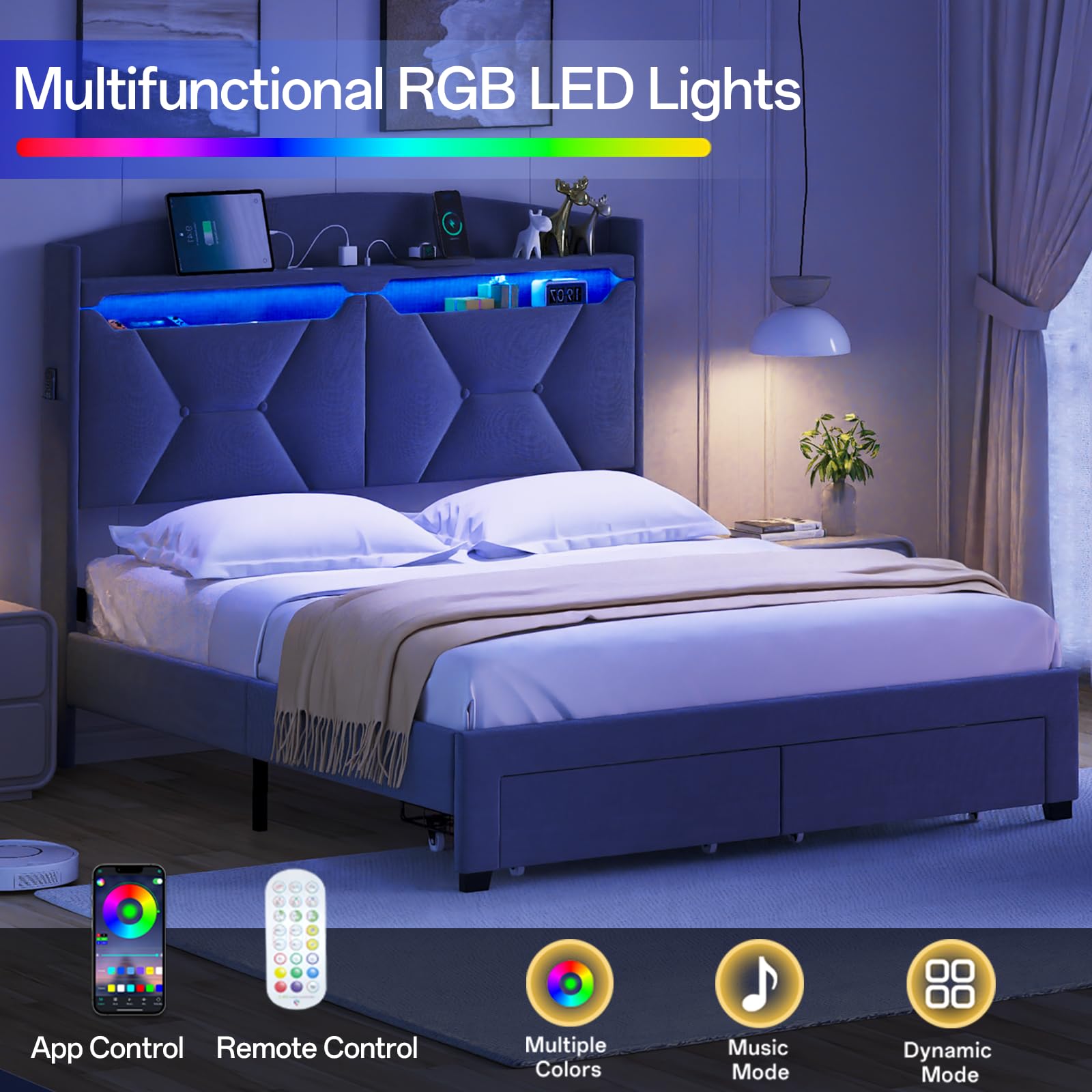 VINTLJUS Queen Size Bed Frame, Queen Bed Frame with Storage Drawers, Upholstered Bed Queen Size with Charging Station and LED Lights, Easy Assembly, Grey