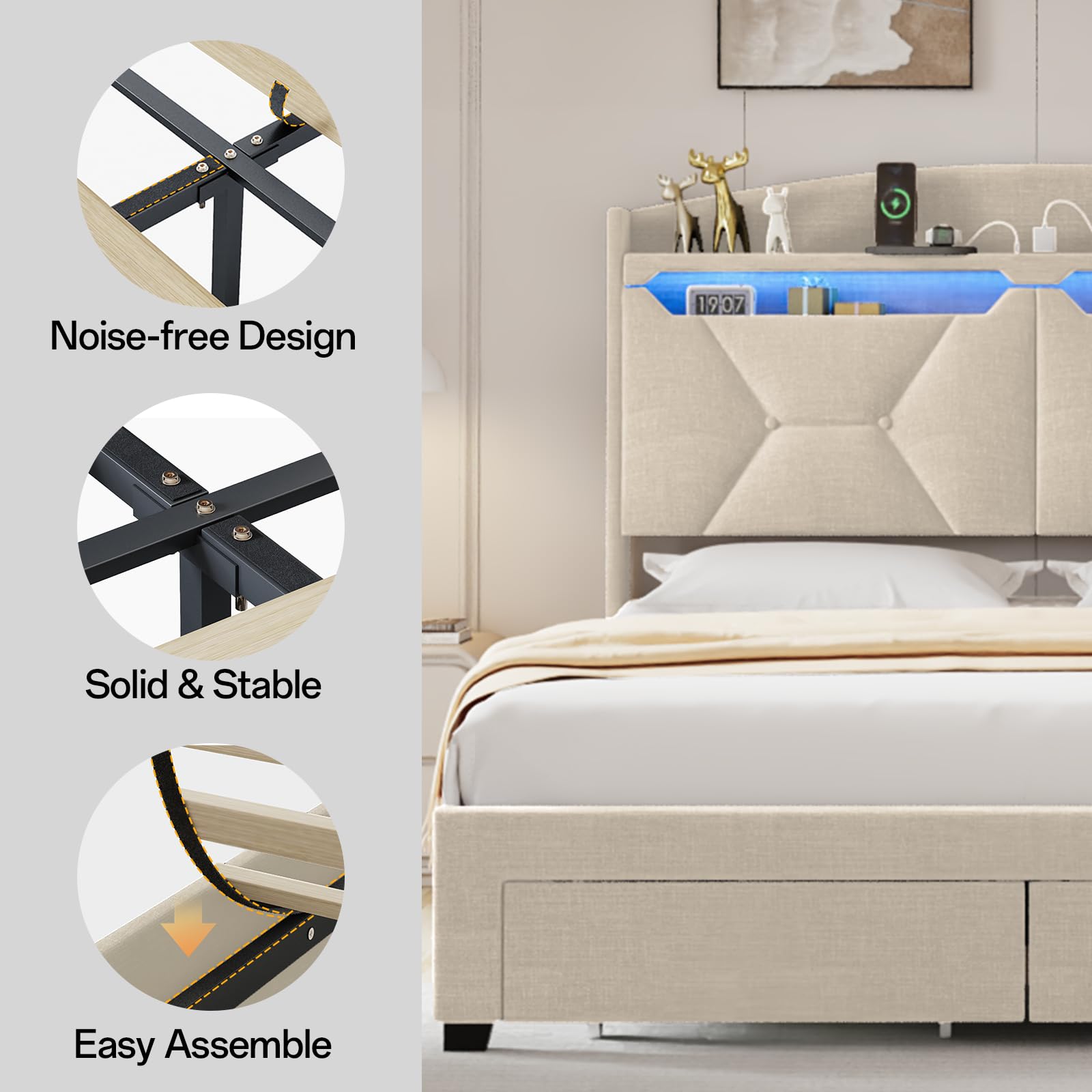 VINTLJUS Queen Size Bed Frame with Storage Headboard, Queen Bed Frame with 2 Drawers, Upholstered Platform Bed with Charging Station and LED Lights, Easy Assembly, Beige