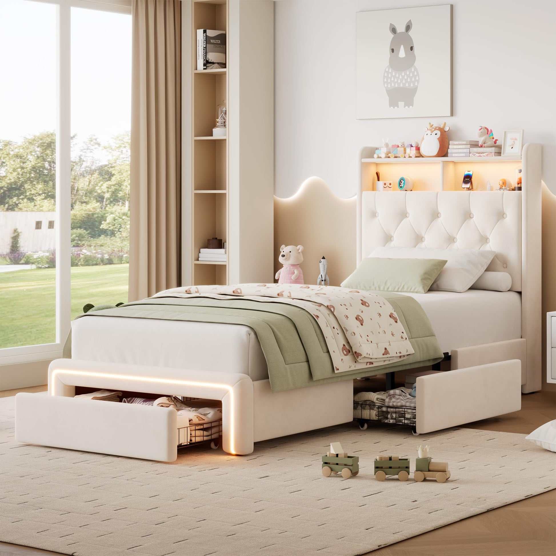 VINTLJUS Twin LED Bed Frame with Storage Headboard & Charging Station, Velvet Fabric Platform Bed Frames with 3 Drawers, No Box Spring Needed, Button Tufted Upholstered, Beige