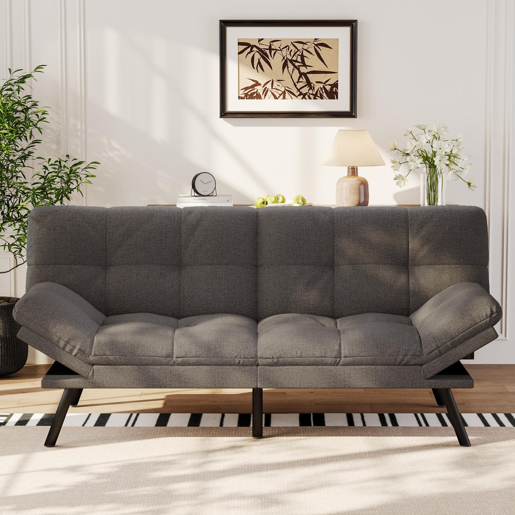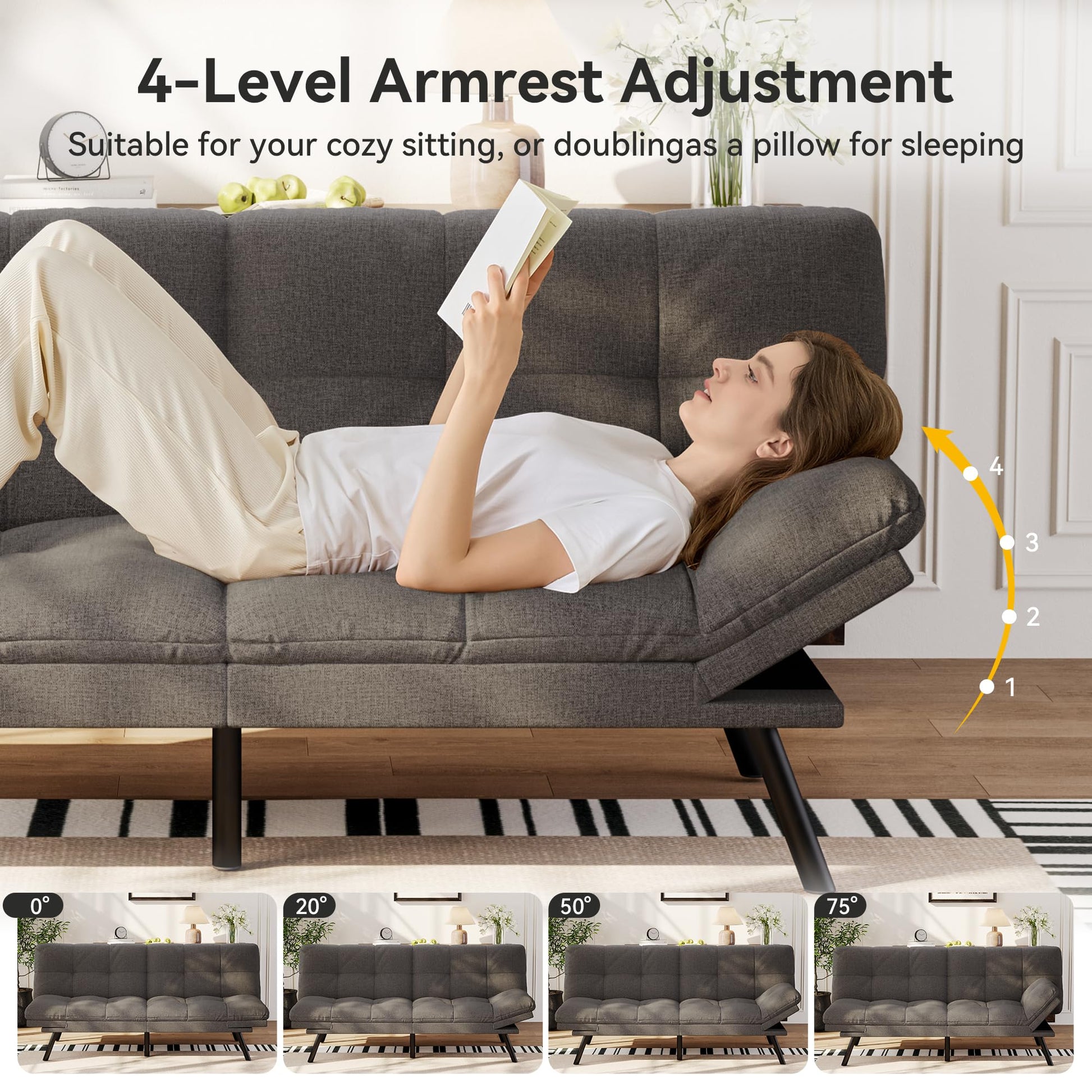 Vipbear 71" Convertible Futon Sofa Bed,Linen Fabric Futon Couch with Detachable Cushion,Adjustable Backrest & Armrest,Modern Loveseat Sleeper Recliner for Living Room,Office,Apartment,Dark Grey