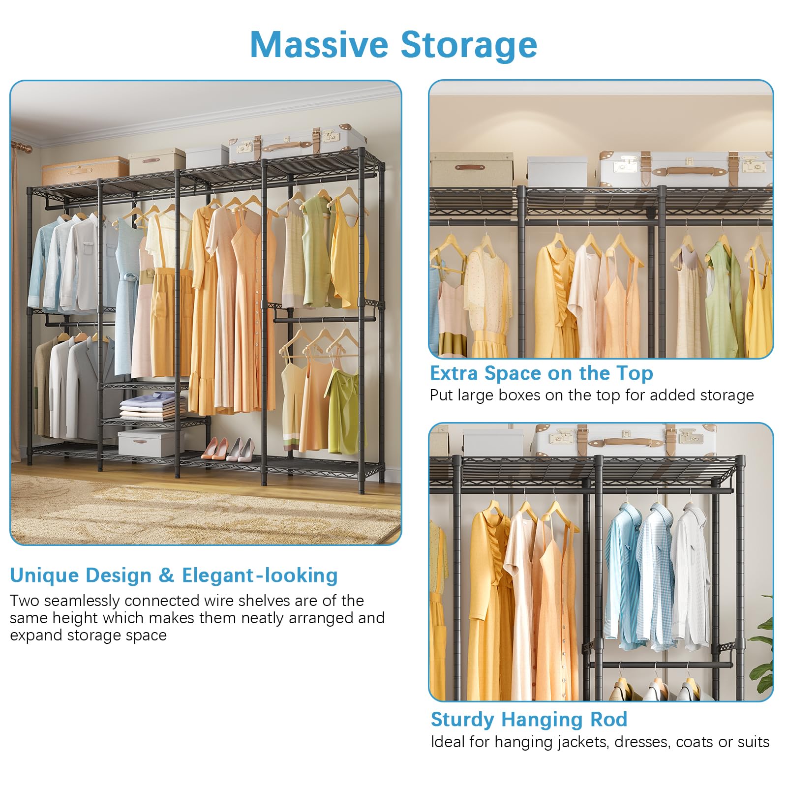 - All-in-one Multifunction Closet Rack: 4 Tiers Extra Large Wardrobe Closet V40 offers you various storage area to place your clothes, accessories, shoes, etc. It features 6 height adjustable shelves for extra storage capacity, 4 detachable hanging bars that easily accommodates to the length and size of your garments.