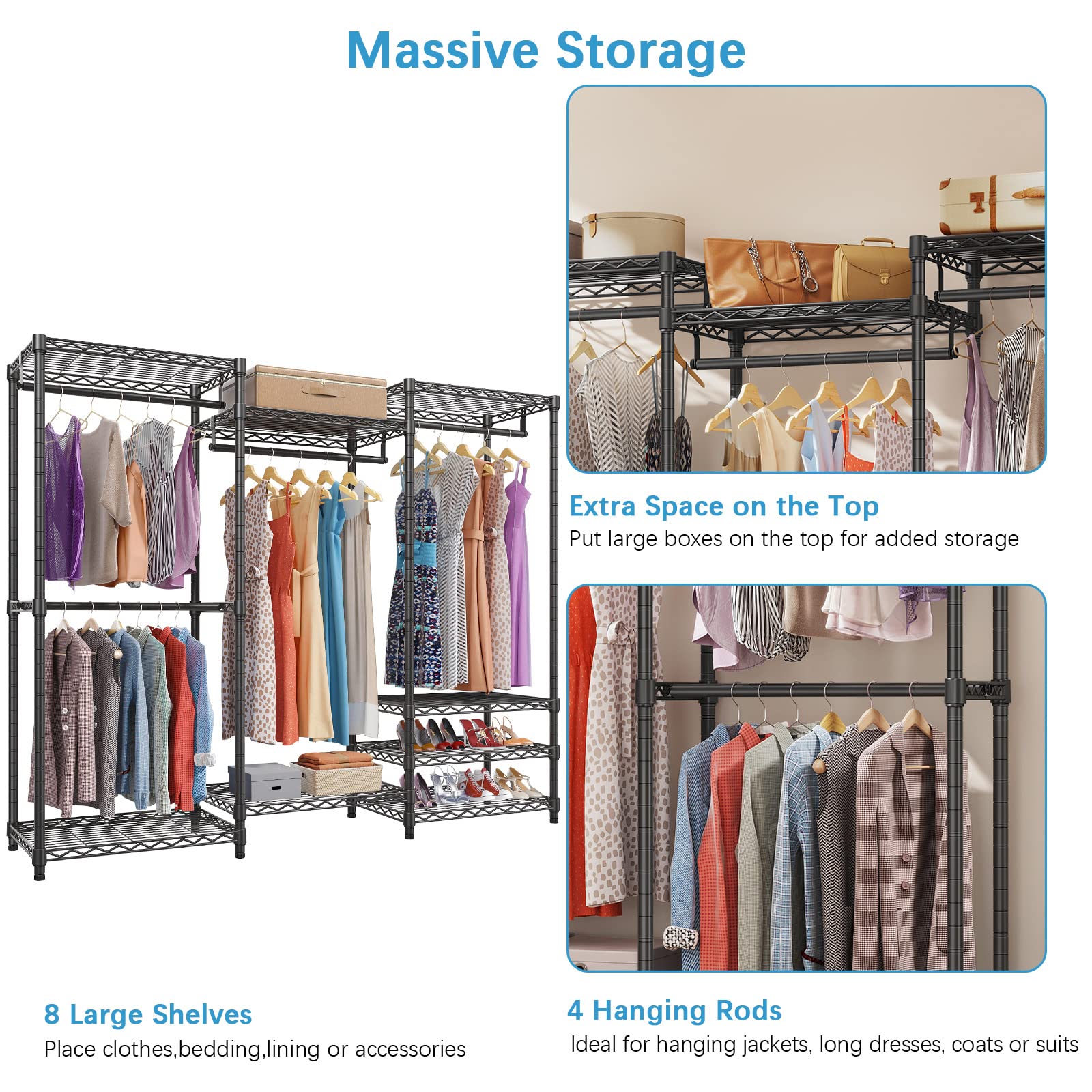 - Multifunction Closet Rack: VIPEK V5C Garment Rack comes with 8 adjustable Shelves & 4 removable hanging rods, it's possible to configure in different ways. Assembly was quick and easy. Raise or lower the shelving to customize the Well-Organized wardrobe closet of your dreams, and MAXIMIZE YOUR SPACE!