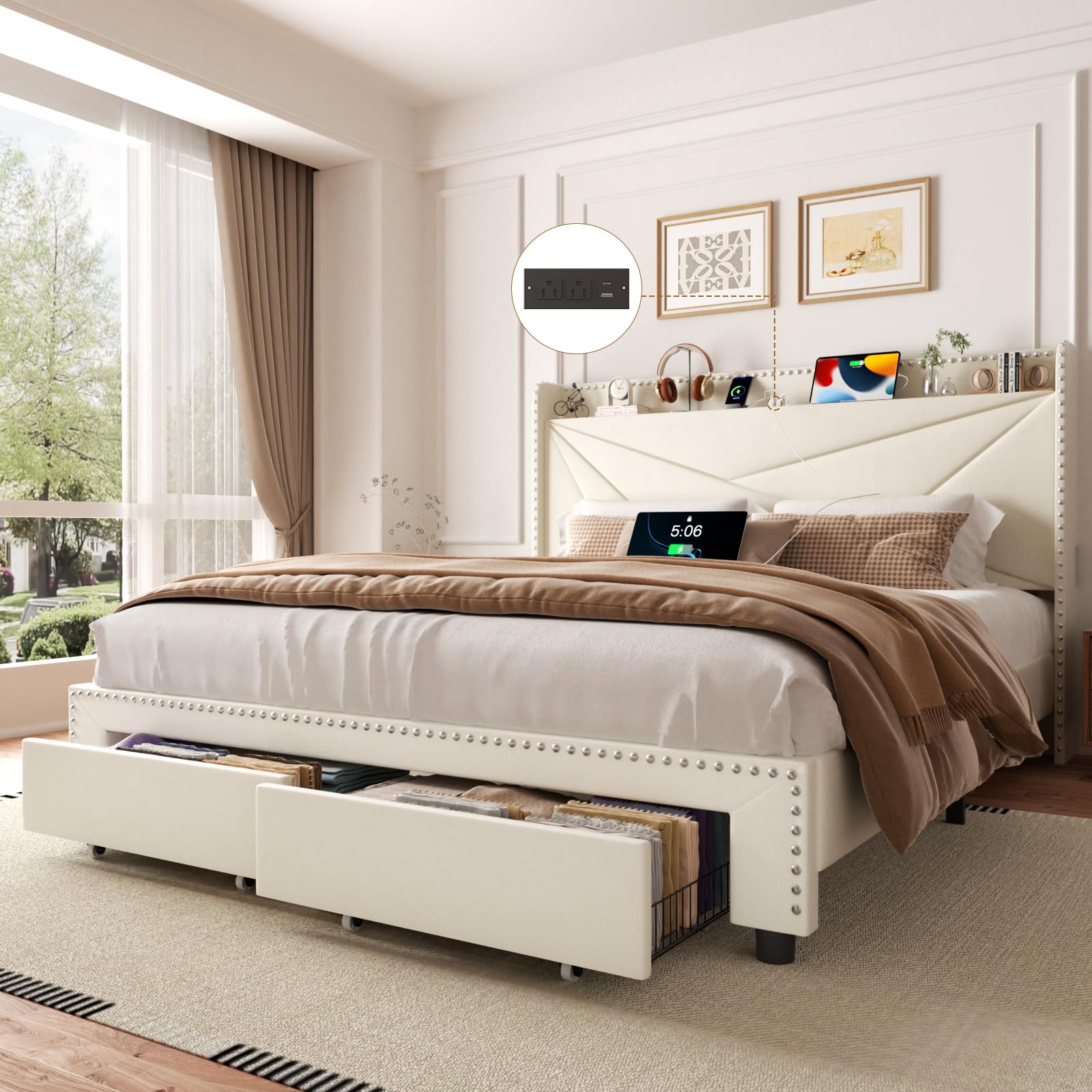 viplov King Size Bed Frame with 2 Large Drawers, Storage Headboard Built-in Charging Station, Modern Chic Rivet Design, Easy Assembly, No Box Spring Required, Noise-Free, Beige