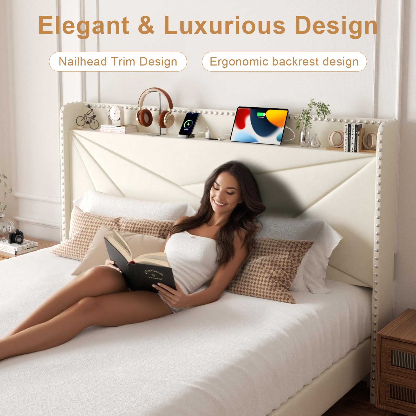 - Multi-functional Headboard: Storage Headboard includes 2 standard outlets—1 Type-C and 1 USB port—helping keep your devices organized and powered.