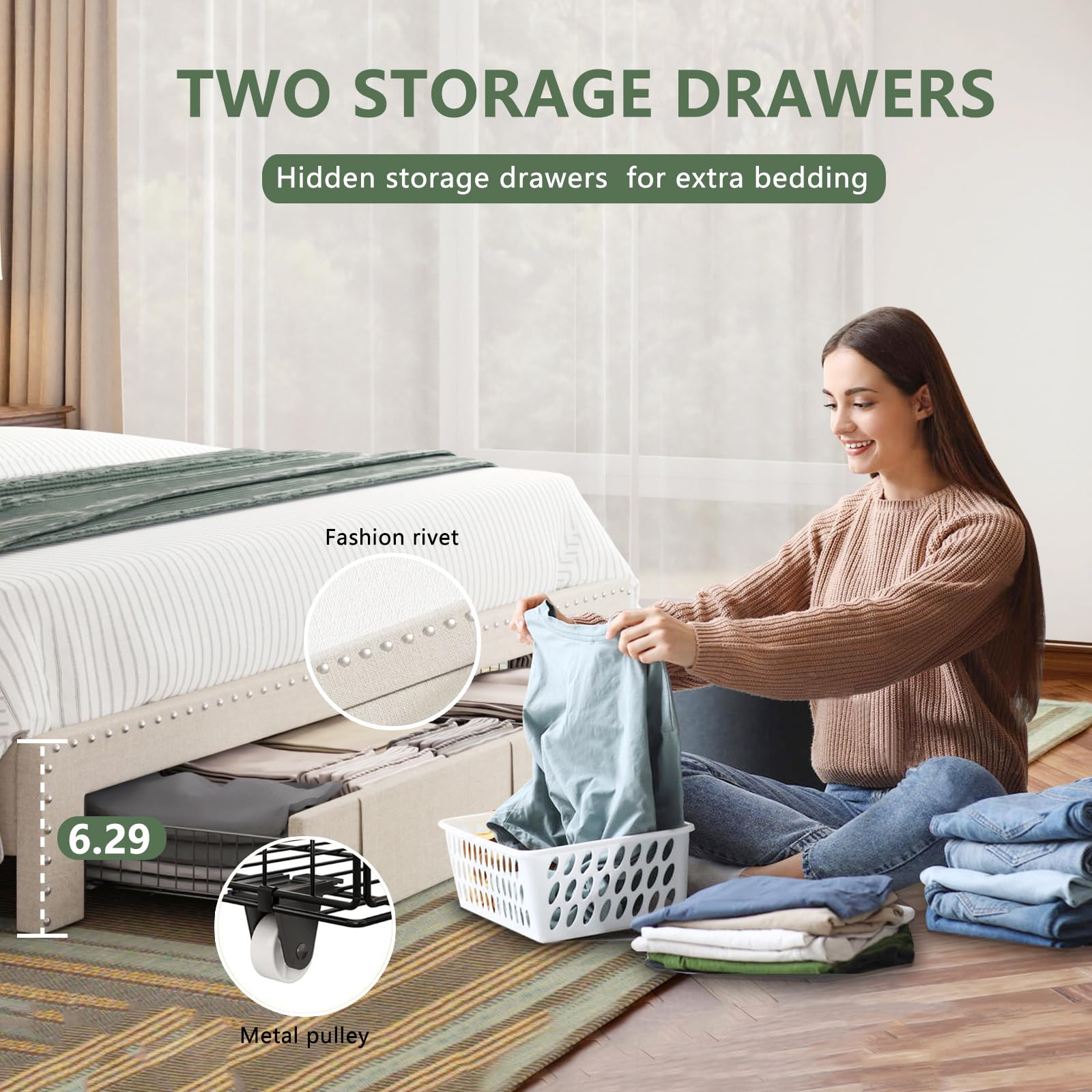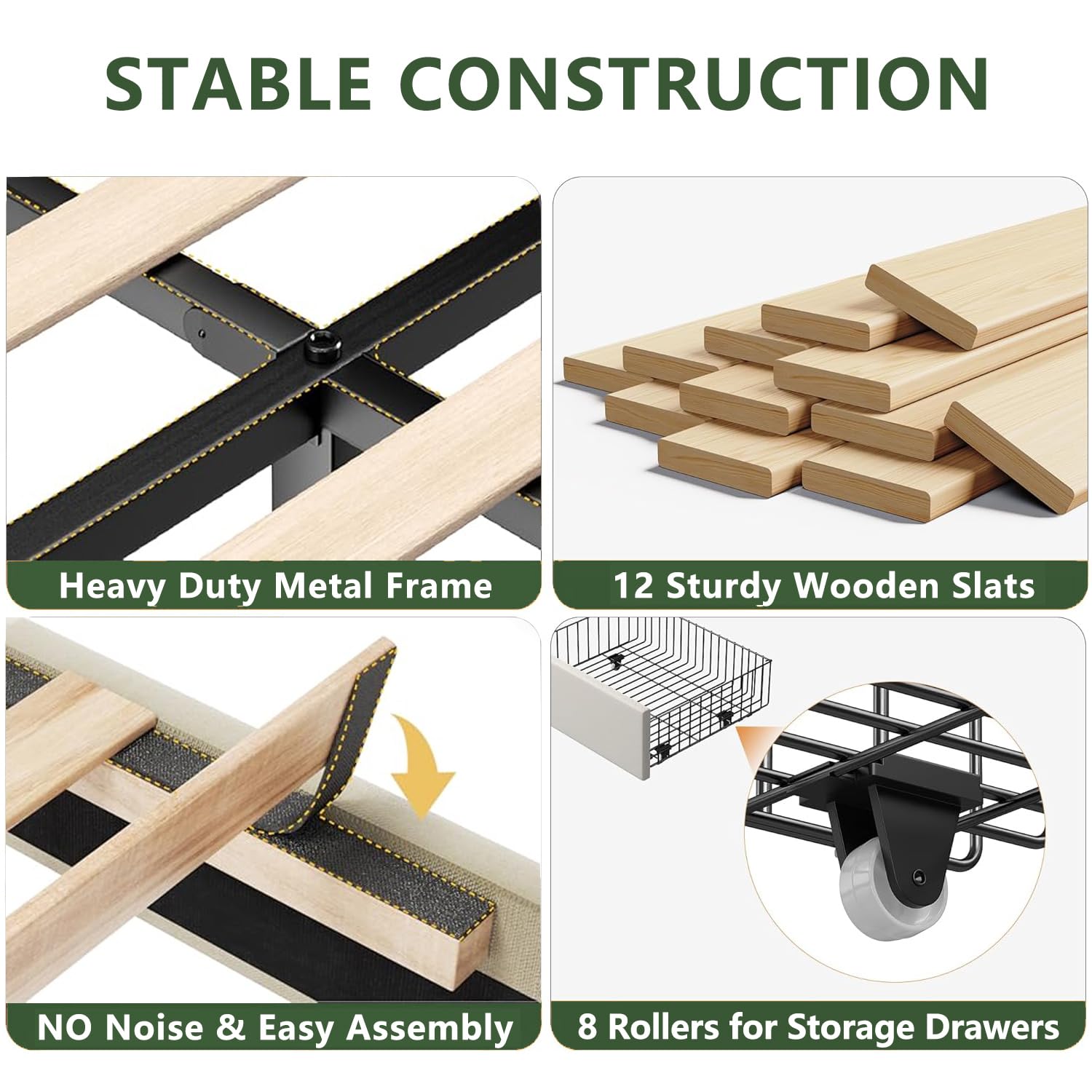 - 【Queen Bed Frame No Box Spring Needed】This bed frame is constructed with a solid metal frame featuring 9 support legs and 12 wooden slats, providing strong support for your mattress, and is perfect for a family of five. Our bed frame is designed for easy assembly, ensuring a hassle-free setup. Upholstered platform bed with 2 drawers, No box spring needed, Noise-free design, Get your dream bedroom ready today!
