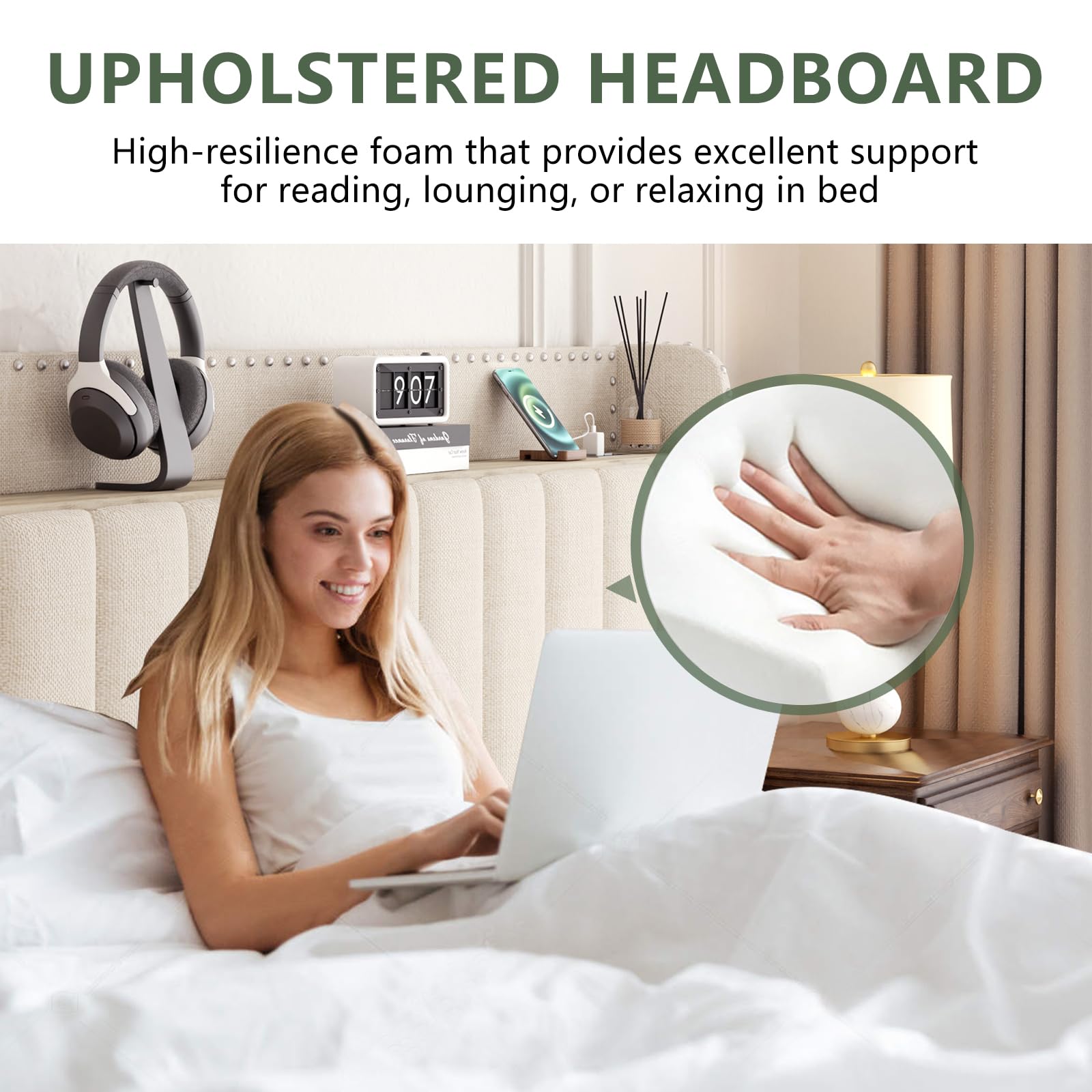 - 【Queen Size Bed Frame with Nailhead Trim Design】The headboard of this bed frame is upholstered in high-quality linen fabric that feels soft and skin-friendly. Filled with high-resilience foam, it offers comfortable support for your back, making it easy to relax while reading or resting. Delicate nailhead trim outlines the edges of the headboard, showcasing fine craftsmanship and adding a touch of vintage charm and stylish detail, enhancing the overall elegance and character of your bedroom.