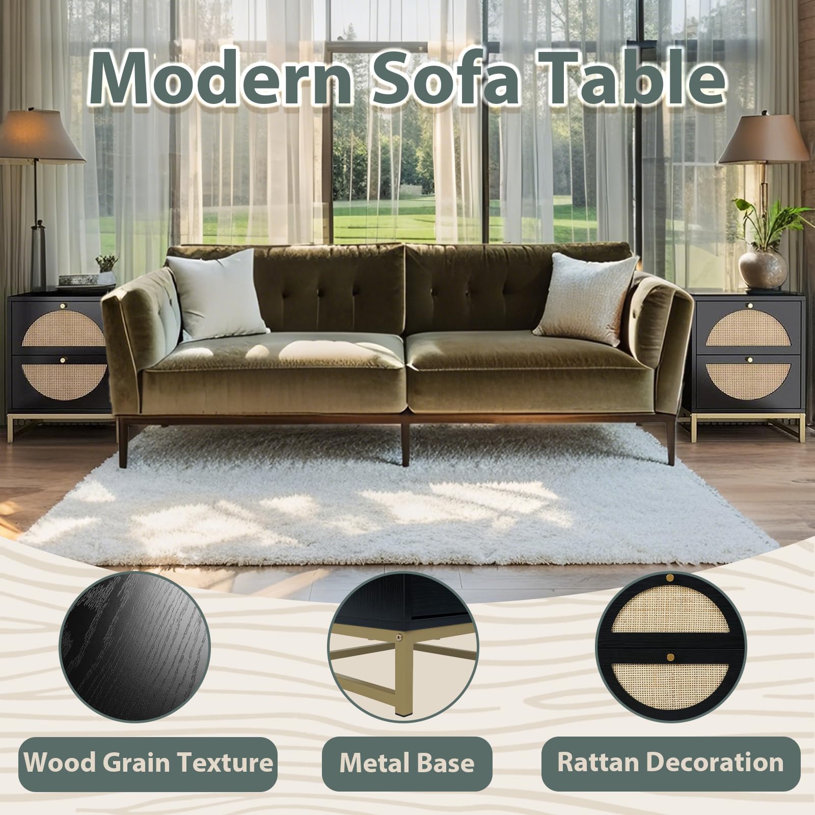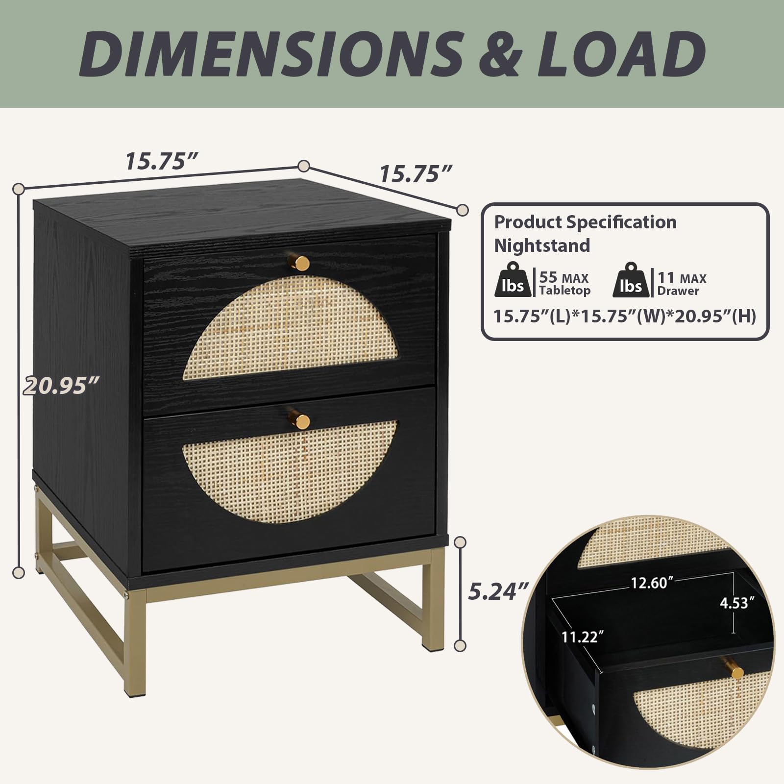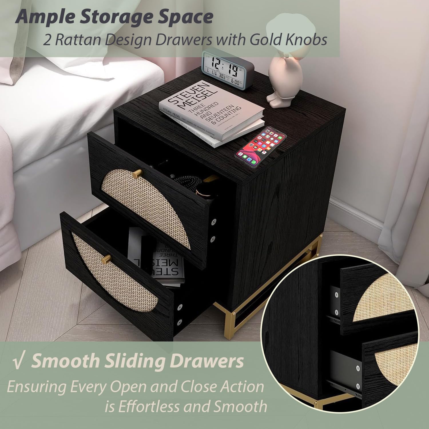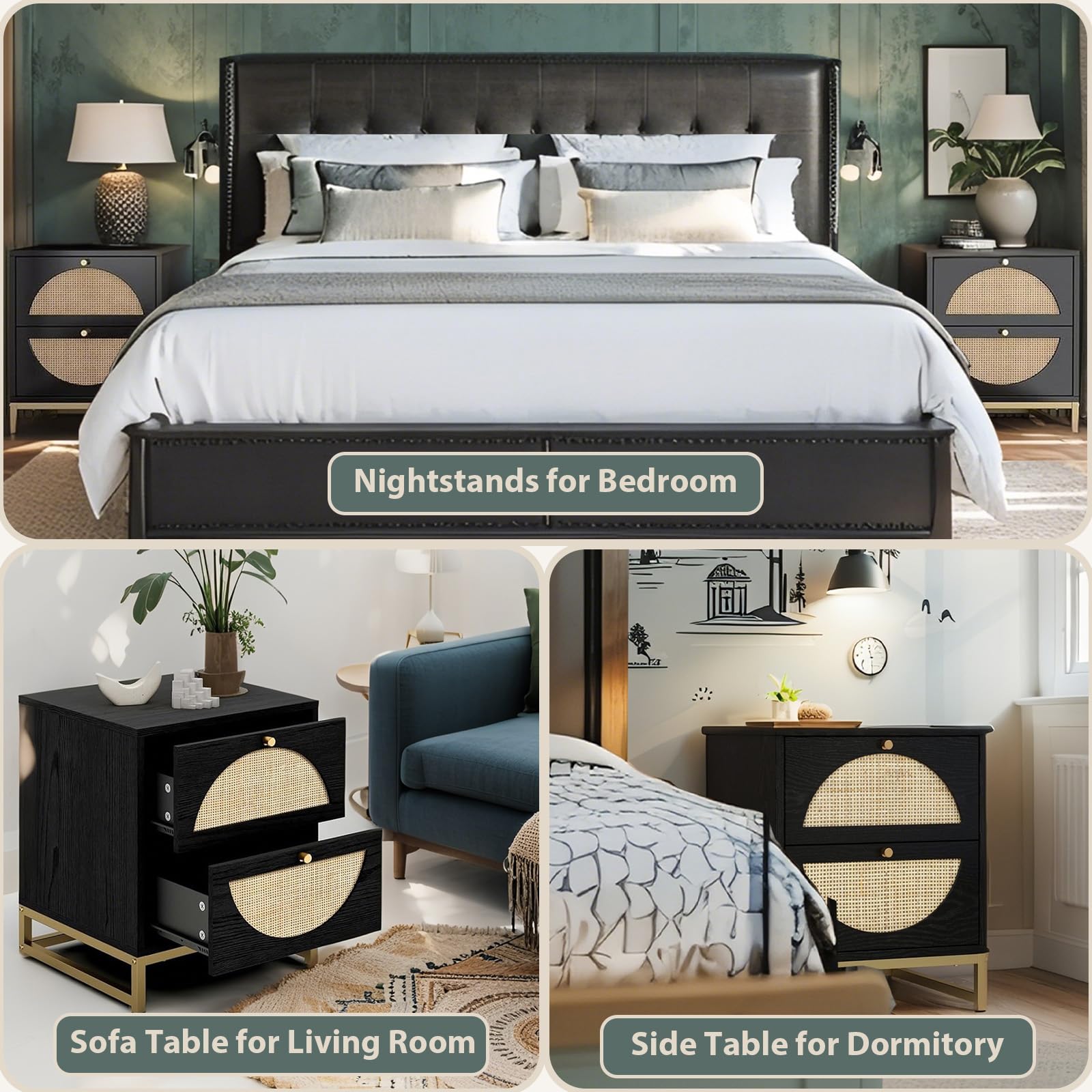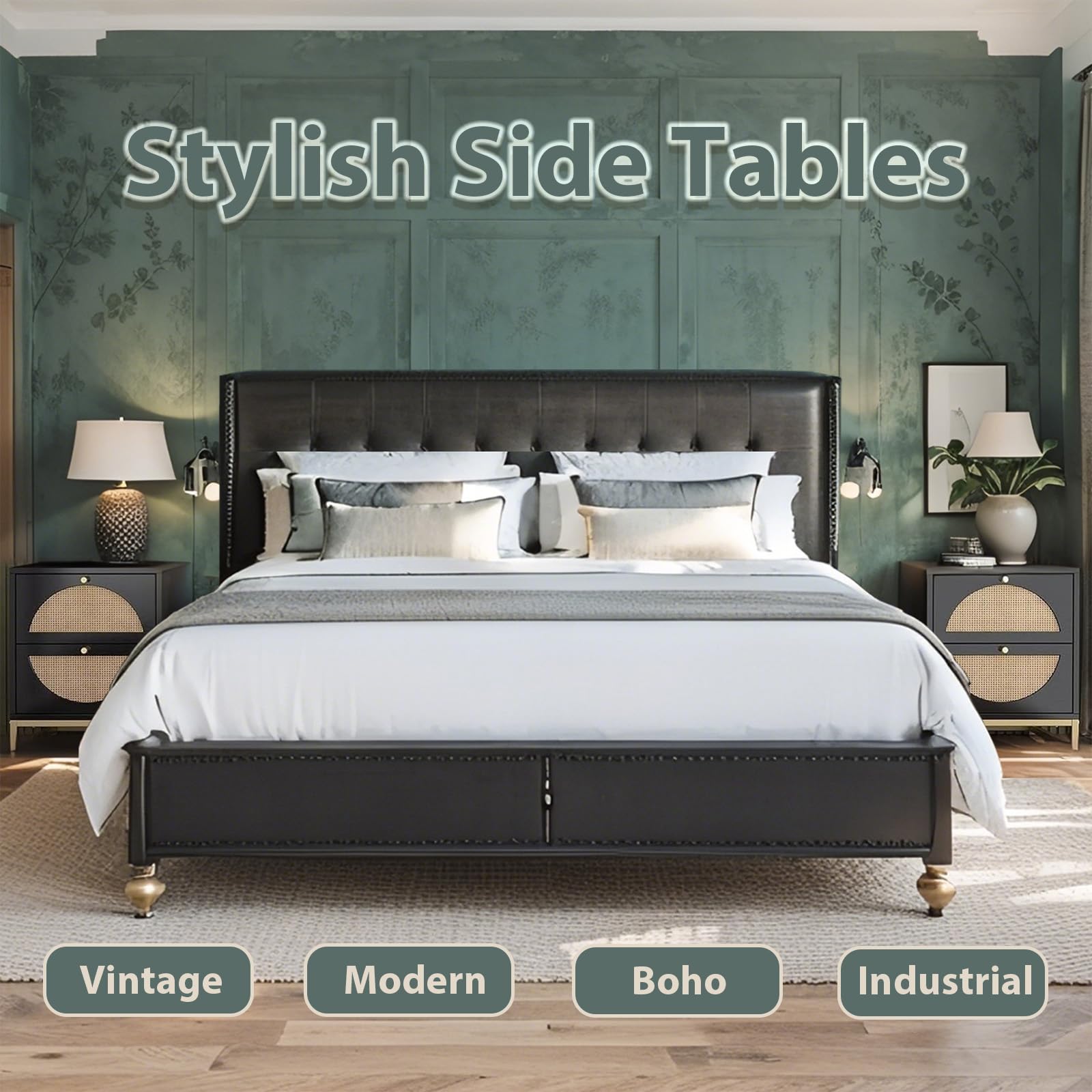 vistavie Rattan Nightstand with 2 Drawers, Wooden End Table Rattan Weaving Bedside Table Accent,Rustic Side Table Night Stand with Storage,for Living Room Bedroom (Black, Set of 2)
