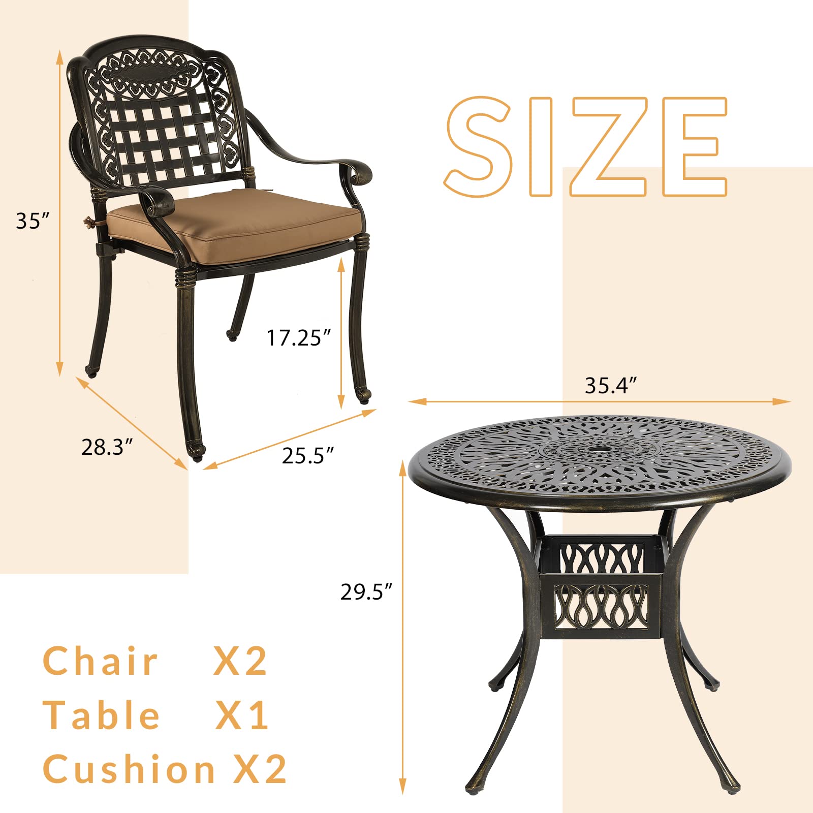 - 【Durable 3-Piece Dining Set】 - Made from cast aluminum for long-term durability. Resistant to rust, weather, fade, crack. This patio set includes 1 round table, 2 chairs, and they stay in perfect condition regardless of the weather. It's also easier than ever to clean, just use a dry or damp rag to wipe down.