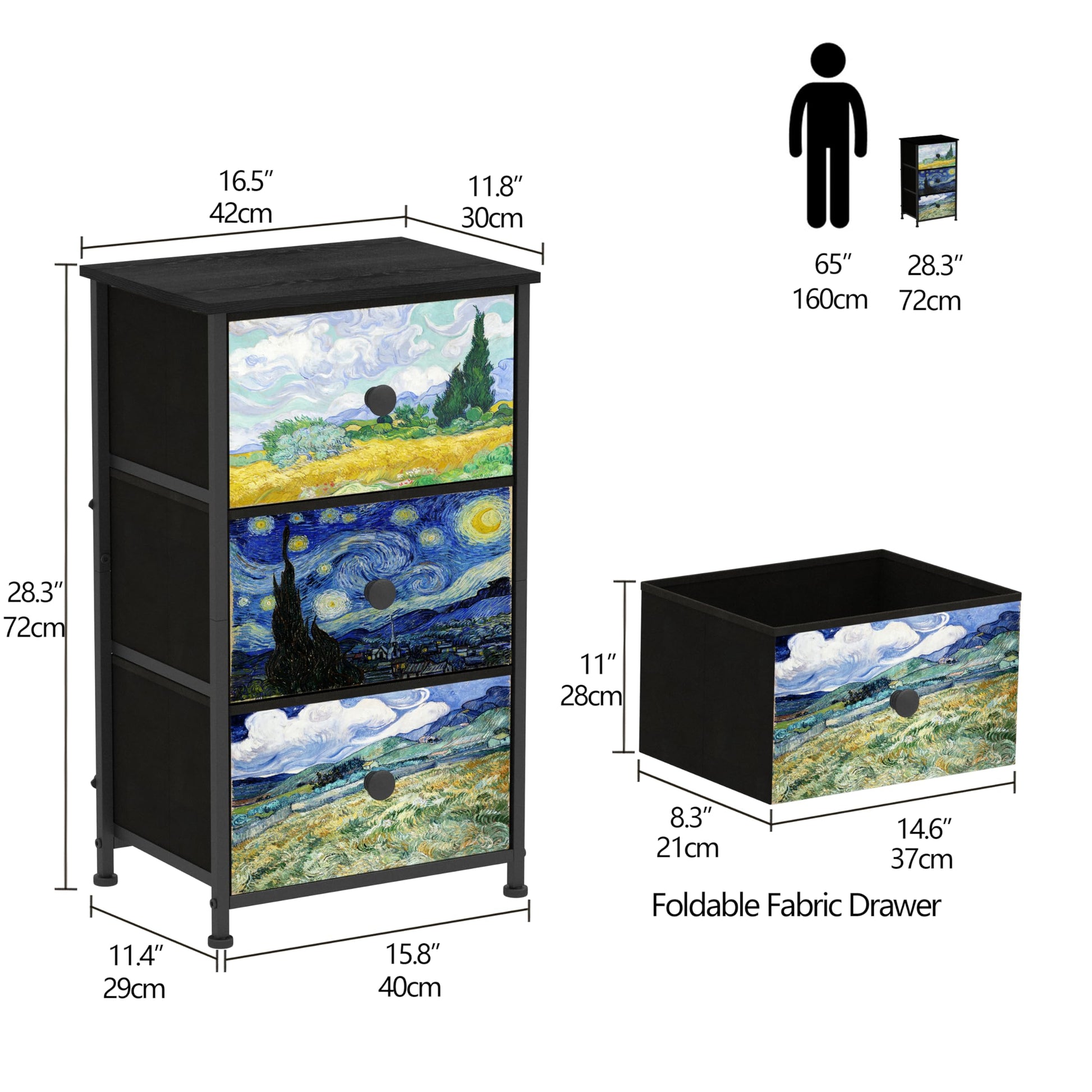 - 3 Drawers Large Capacity: Each Drawer size: L-14.6' x W-8.3' x H-11', overall dimensions: 16.5'(L) x 11.8'(W) x 28.3'(H). There has 3 Van Gogh style fabric drawers, easy-pull wooden handles help open and close the drawers smoothly, which is practical and fashionable