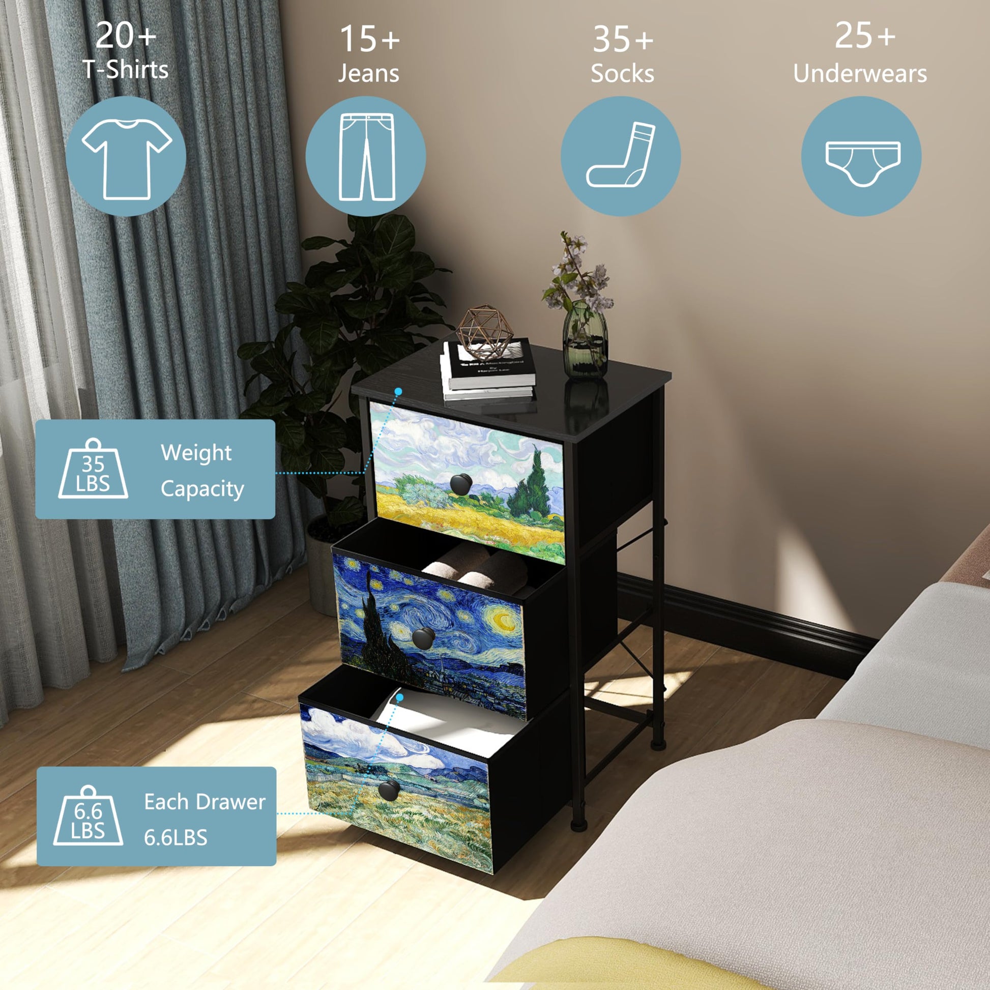 Welfuturer Dresser with 3 Drawers Van Gogh Drawer Dresser for Bedroom Narrow Nightstand Small Dressers & Chests of Drawers for Halfway Entryway Closets Living Room Sturdy Steel Frame Wood Top