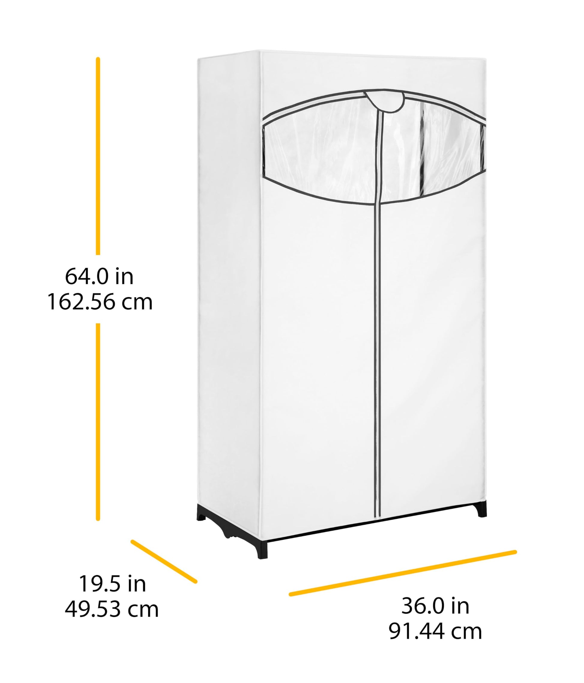 Whitmor's perfect solution for your clothes storage needs. This new and improved 36-Inch extra wide stand alone clothes closet has a sturdy heavy-duty zippered front for convenient, trouble-free access. New easy assembly uses a durable bungee cord system and improved, sturdier plastic connectors. Heavier weight white polypro cover has added blue trim and a larger clear window to view contents in closet. More clothes can be stored because of added wired support for the 36-Inch closet rod. Assembled size: 19-1/2-Inch W by 36-Inch L by 64-Inch H.