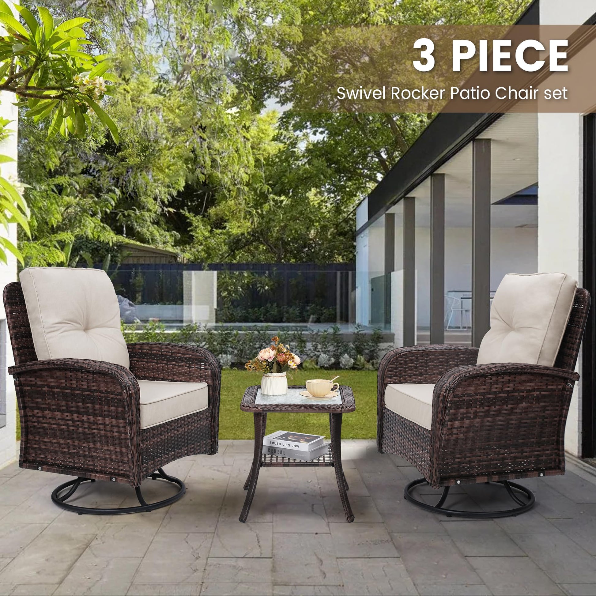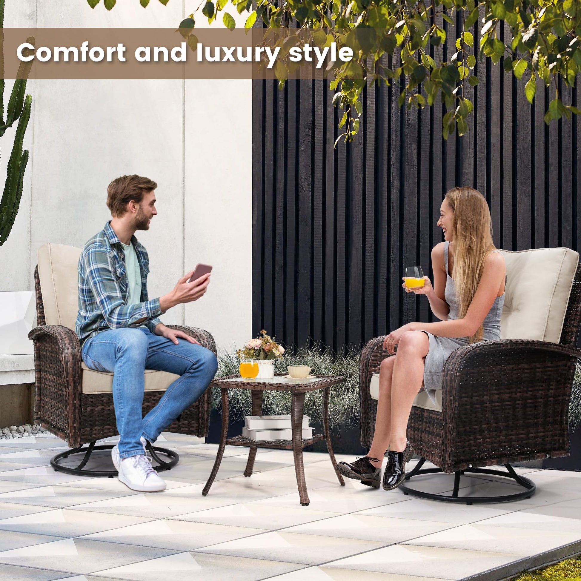 wildformers 2 Luxury Outdoor Swivel Wicker Glider Patio Chairs with Table Set, Overstuffed Washable Cushions, Ideal for Porch, Balcony, Deck, Brown Rattan and Beige Cushions