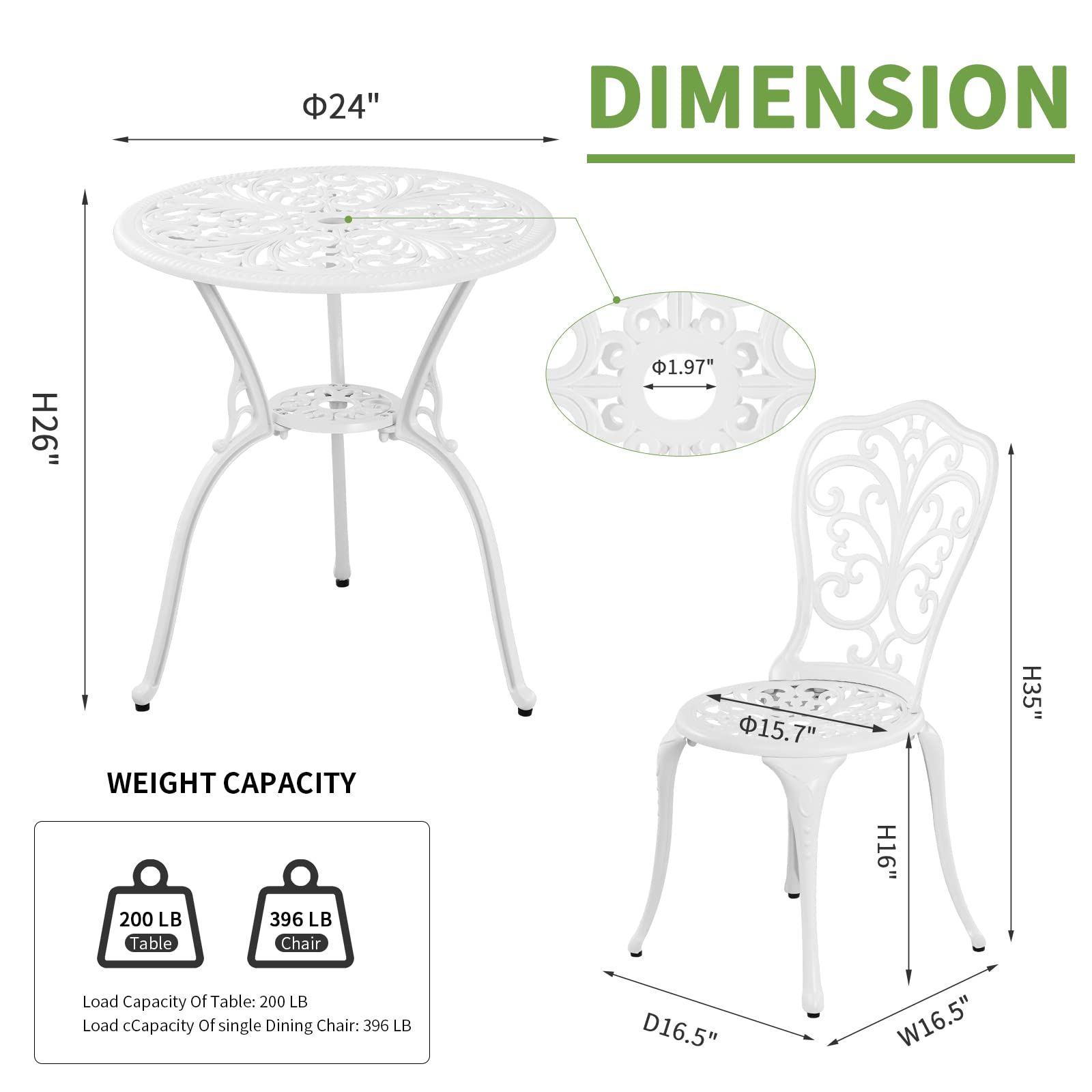 - 【Durable White Bistro Sets】: Bistro table set made of solid cast aluminum with black power coating finish, which is waterproof and rustproof, anti-corrosion, anti-cracking and anti-oxidation. All screw fittings are also made of rust-resistant material. High-quality materials ensure that this bistro set is durable to last for many years to come!