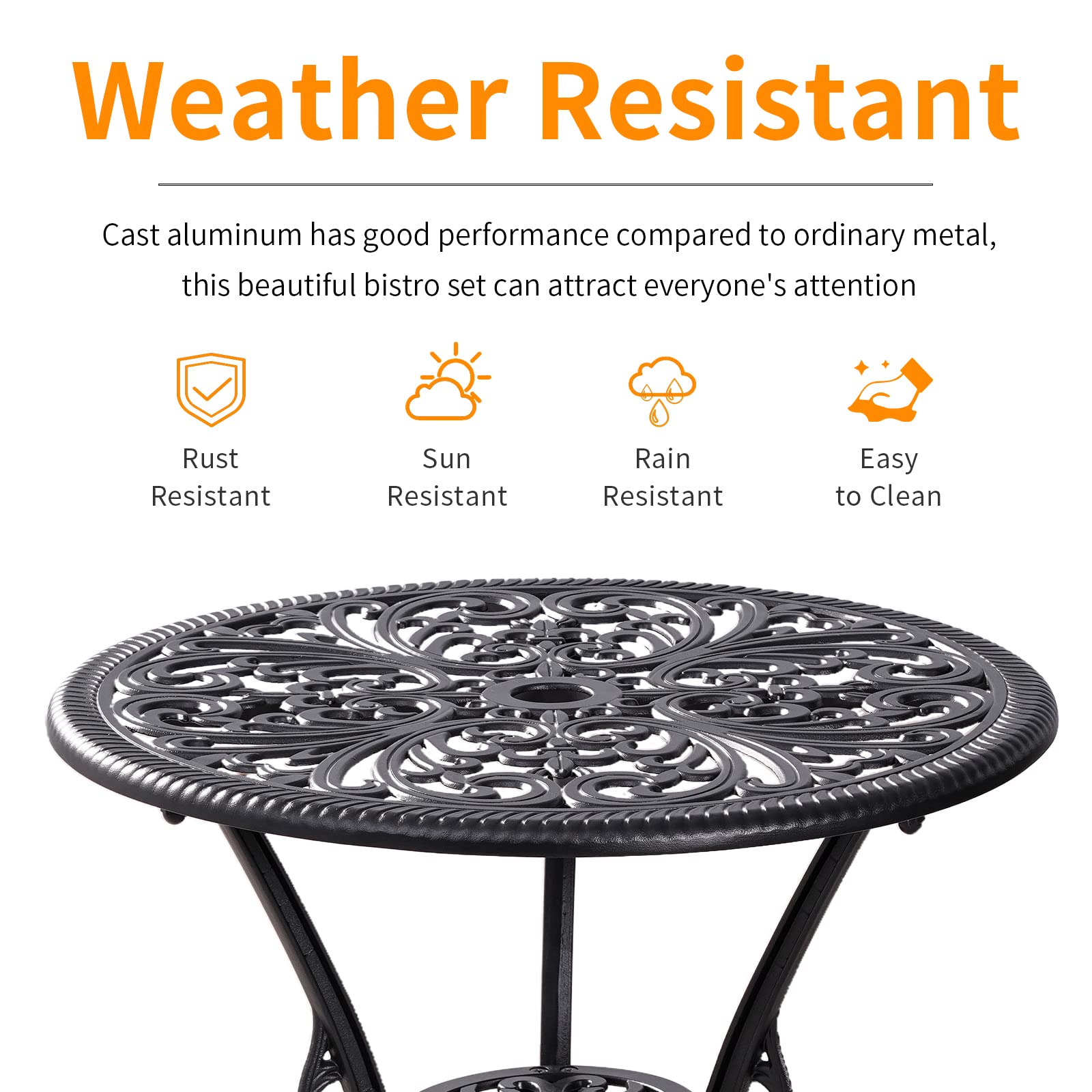 - 【Fit an Umbrella】1.97' Umbrella Hole on the bistro table set can be filled with a patio umbrella (not included), protecting you from the UV and rain. heavy duty cast aluminum frame and smooth edge detail providing you with peace of mind. With its perfect size, this bistro table set is an excellent addition to your outdoor space.