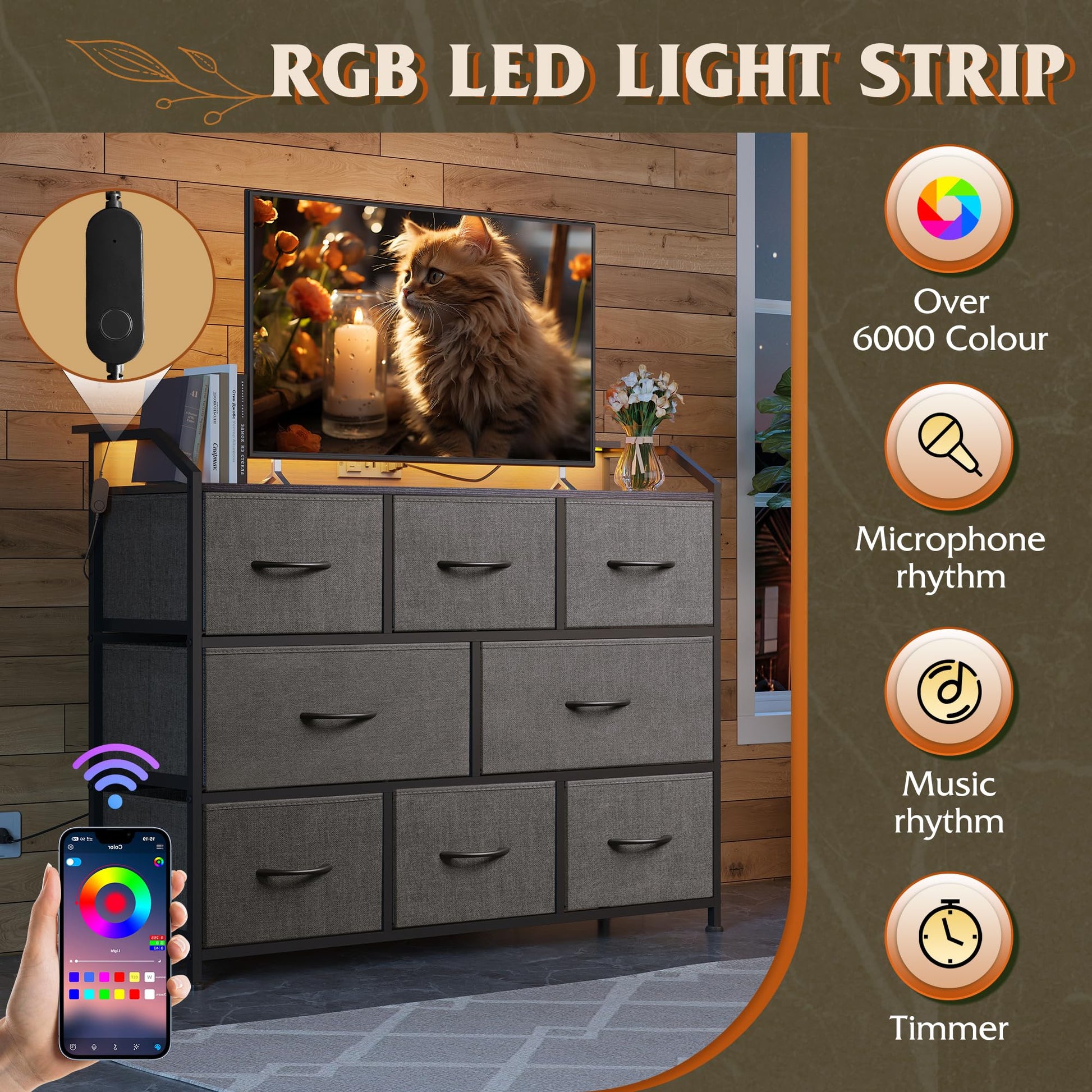 - 【✨Modern Customizable LED Light】This wide fabric dresser is equipped with countless (at least 31) light modes and colors, you can freely adjust the brightness and colors for any scene. The dresser with charging station has 2 USB ports, so you can easily charge your media devices without the need for extra extension cords