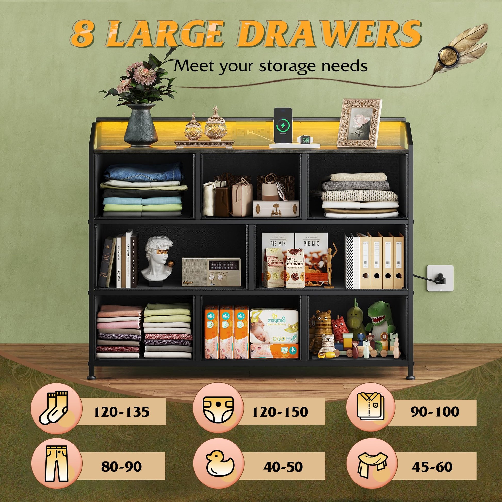 WLIVE Led Dresser for Bedroom, TV Stand for Bedroom with LED Lights and Power Outlet, Wide Chest of Drawers for Hallway, 8 Fabric Drawers for Living Room and Entryway, Charcoal Black Wood Grain Print