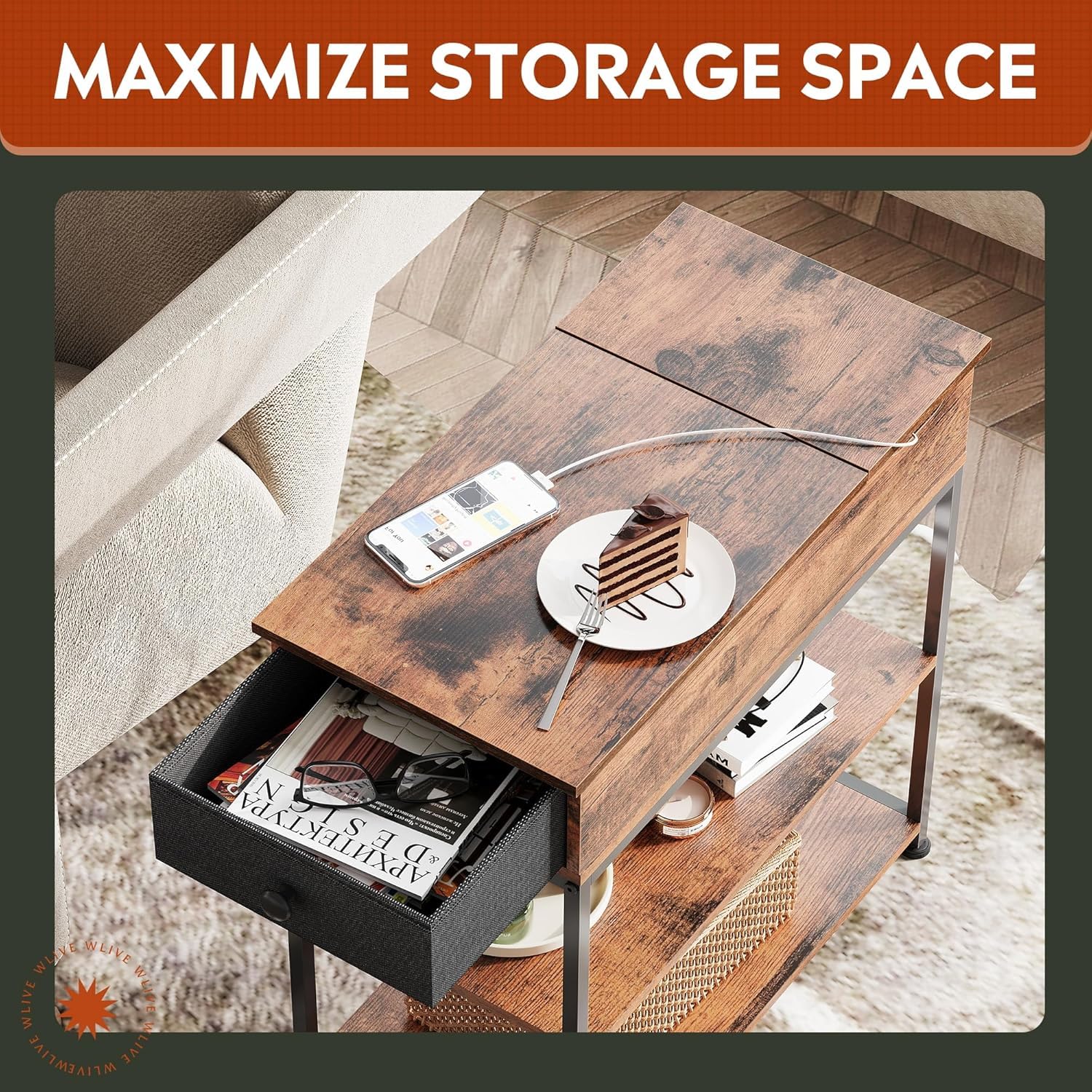 WLIVE Narrow Side Table with Charging Station, End Table for Living Room, Couch Side Table with Fabric Drawer for Bedroon, 11.8‘’W 23.6‘’L 24‘’H, Rustic Brown