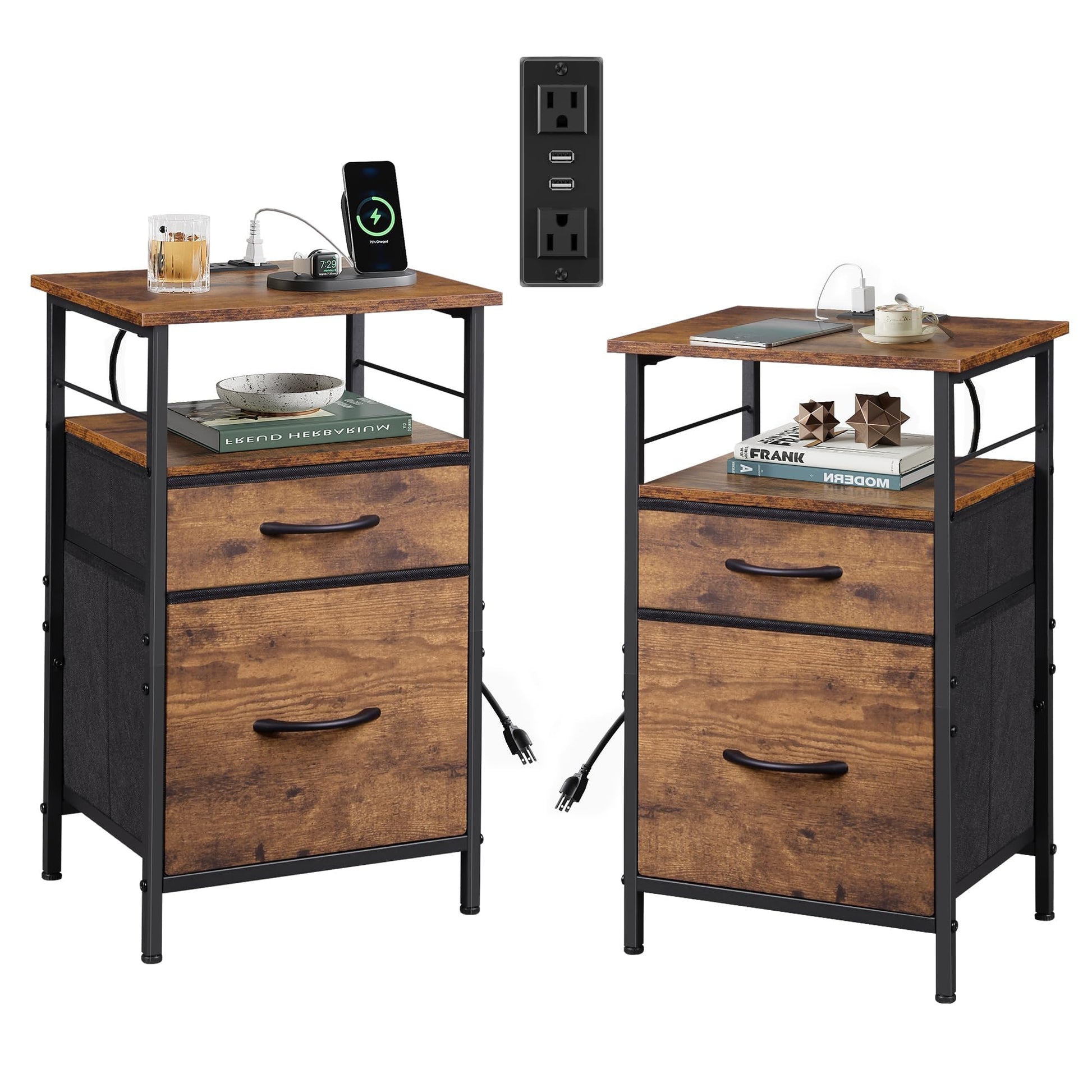 WLIVE Night Stand Set 2, Nightstand with Charging Station, Bedside Tables for Bedroom, Side Table with Fabric Drawers, USB Ports and Outlets, Rustic Brown