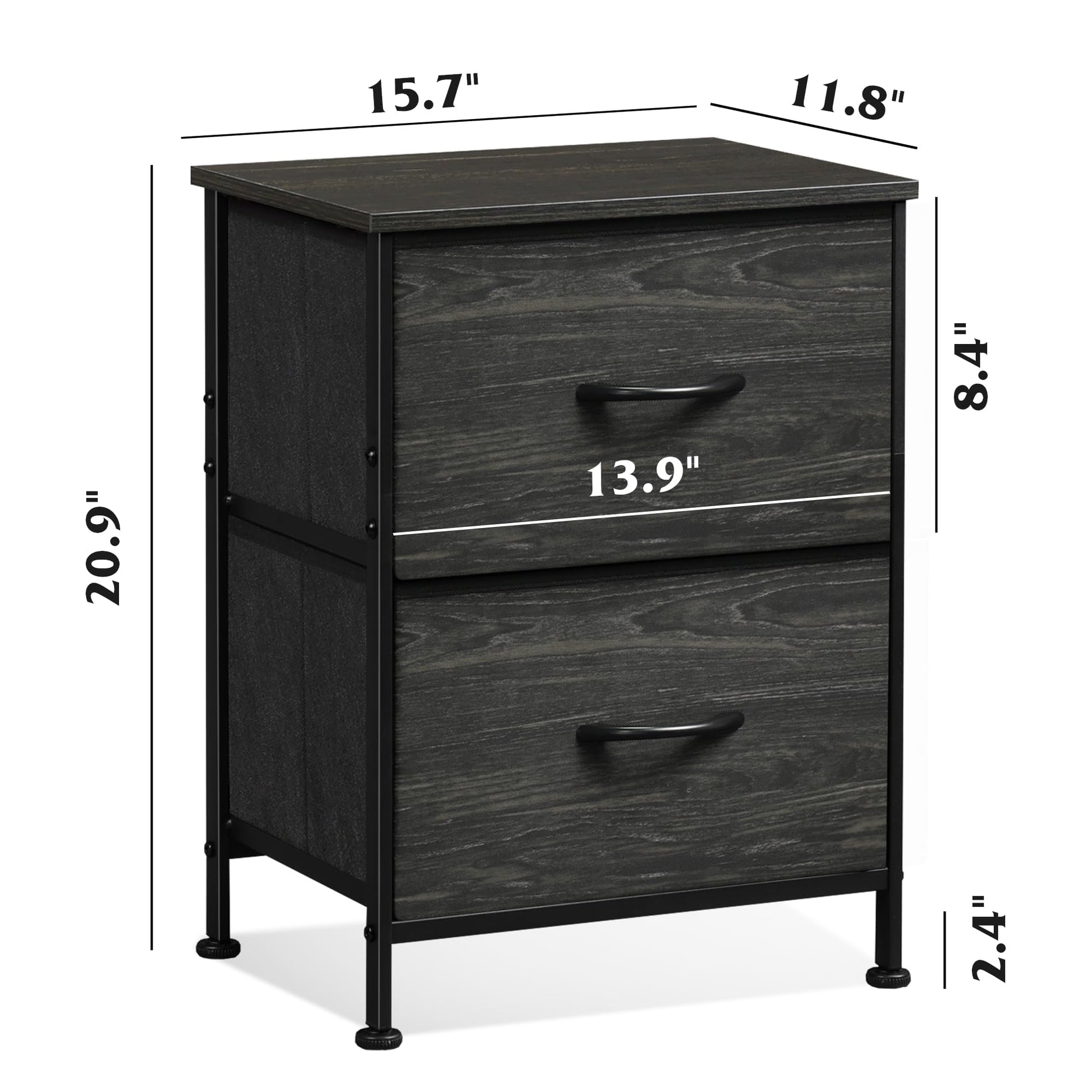 - Easy Assembly: The bedside table can be assembled in 15 minutes with the instructions and tools included in the package. The overall dimensions of the 2 drawer dresser: 15.7' L x 11.8' W x 20.9' H.
