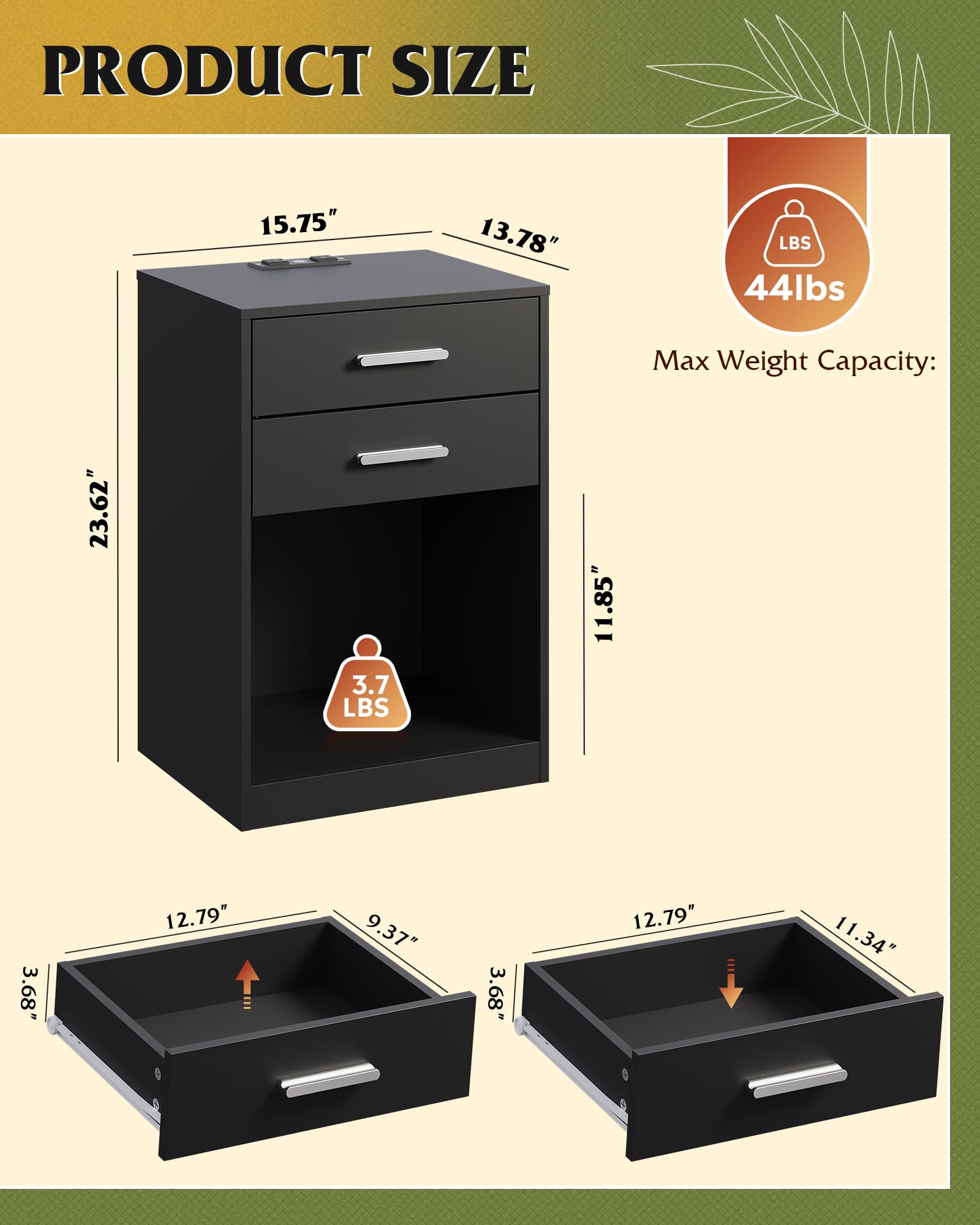 WLIVE Nightstand Set of 2 with Charging Station, Wood Night Stand Sets with 2 Drawers and Open Shelf, Bed Side Tables Bedroom, Living Room, Black