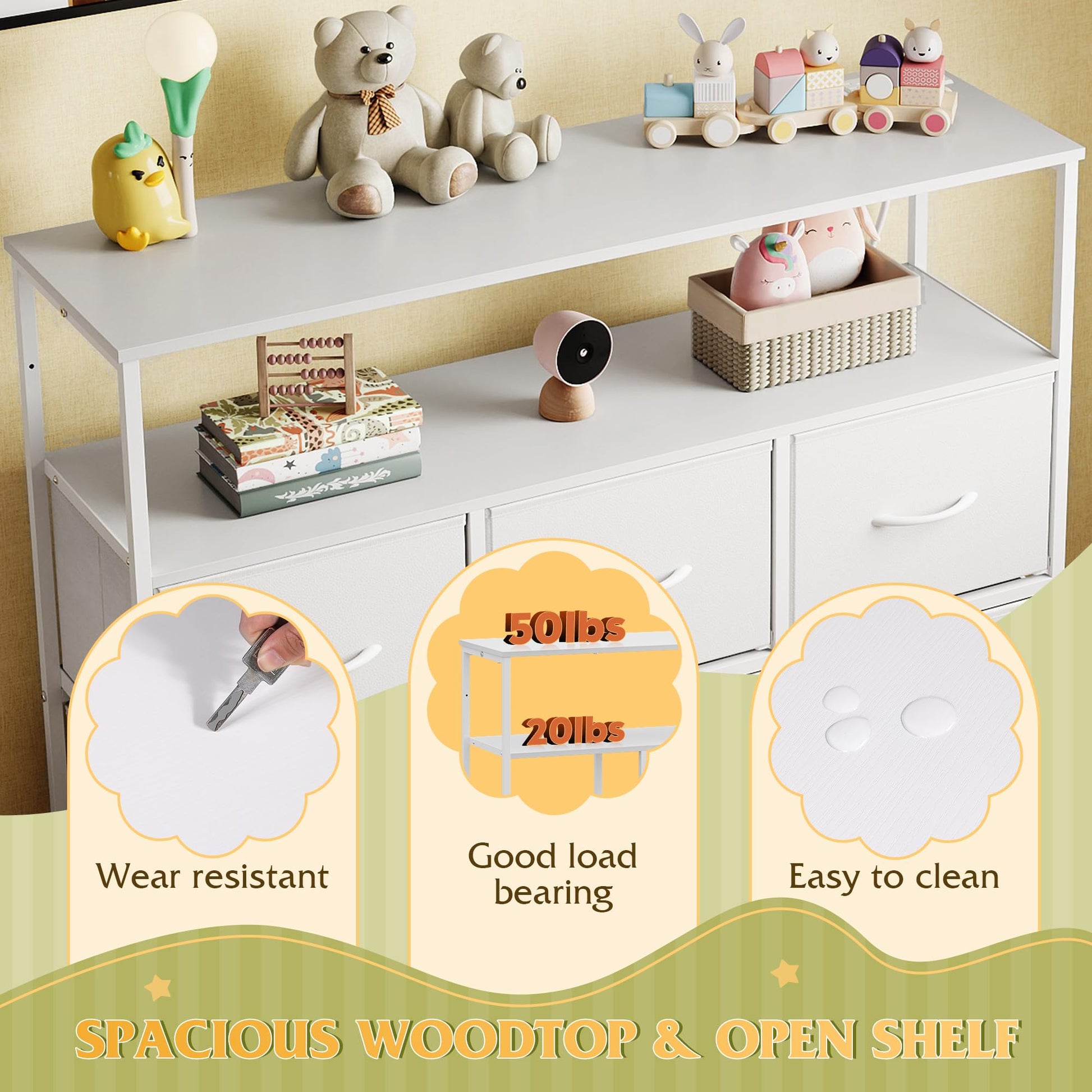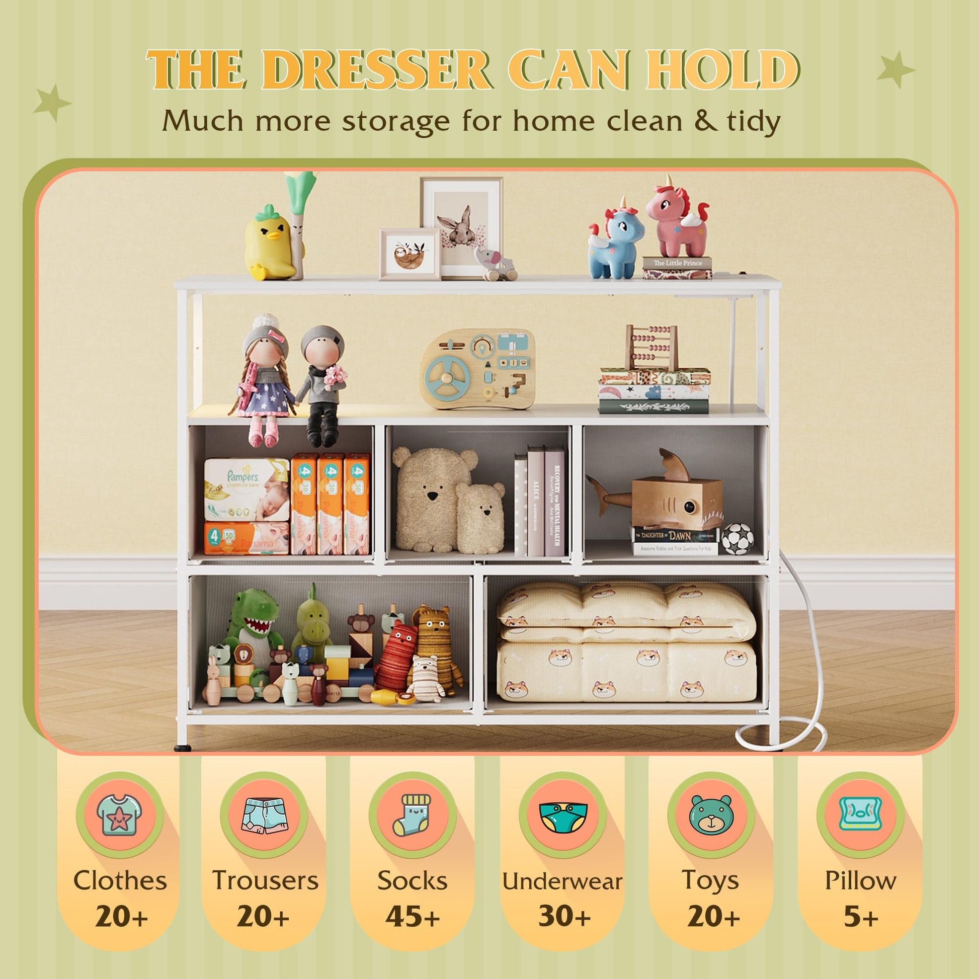 WLIVE White Dresser for Bedroom, 5 Drawer Dressers with Charging Station, Fabric Chest of Drawers with Open Shelves, Storage Dresser for Living Room, Closet, Entryway