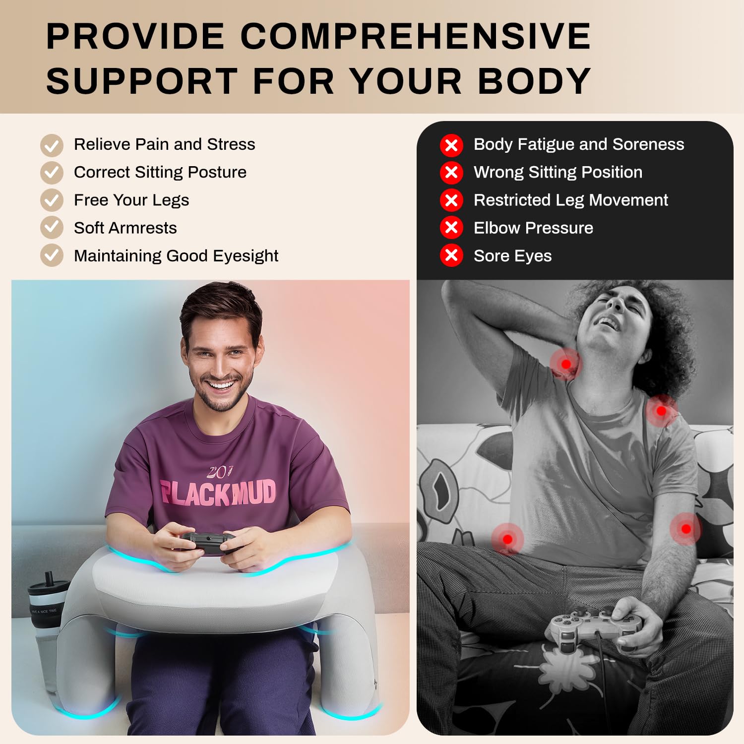 - Ergonomic Design: We have developed this unique reading pillow for bed using a combination of arm support and a desktop. It is larger and more comfortable, with arm support to relax the strength of your arms and a flat desktop to work on your computer. Its top-tier ergonomic design provides unparalleled relaxation for your neck, shoulders, elbows, and hands during extended gaming, gaming accessories handling, reading, or working sessions. It makes an essential gaming pillow for gamers and a comfortable reading pillow for bed and lap, seeking that crucial 1-second advantage over competitors.