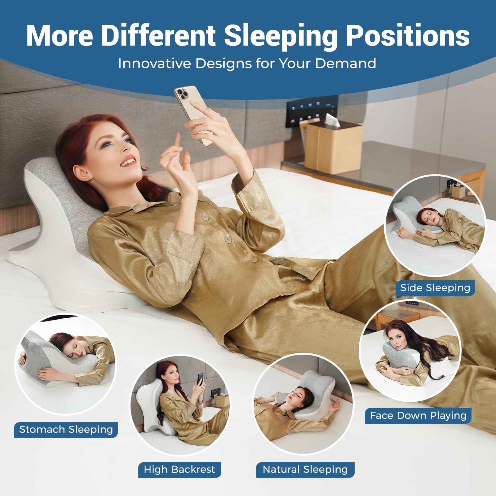 - 2 USAGES IN A PILLOW FOR ANY POSITIONS: Our reading pillow for bed has 2 different curve heights, so you can read books or play with your phone by using the high side as a prone or lean pillow and then sleeping through the low side. The cervical neck pillow is suitable for all kinds of sleeping positions, such as back sleeping, prone position, side sleeping and stomach pillow sleepers etc.