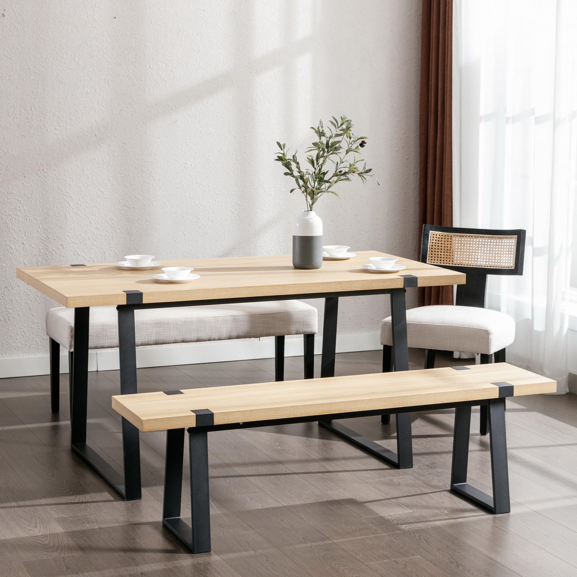 - 【Minimal And Artistic Look】 Finished with a fine polish, the surface of the dining table and bench matches the streamlined lines, displaying a unique taste and style. The natural panels are perfectly matched with the rustic metal legs, injecting a freshness into the interior home space.
