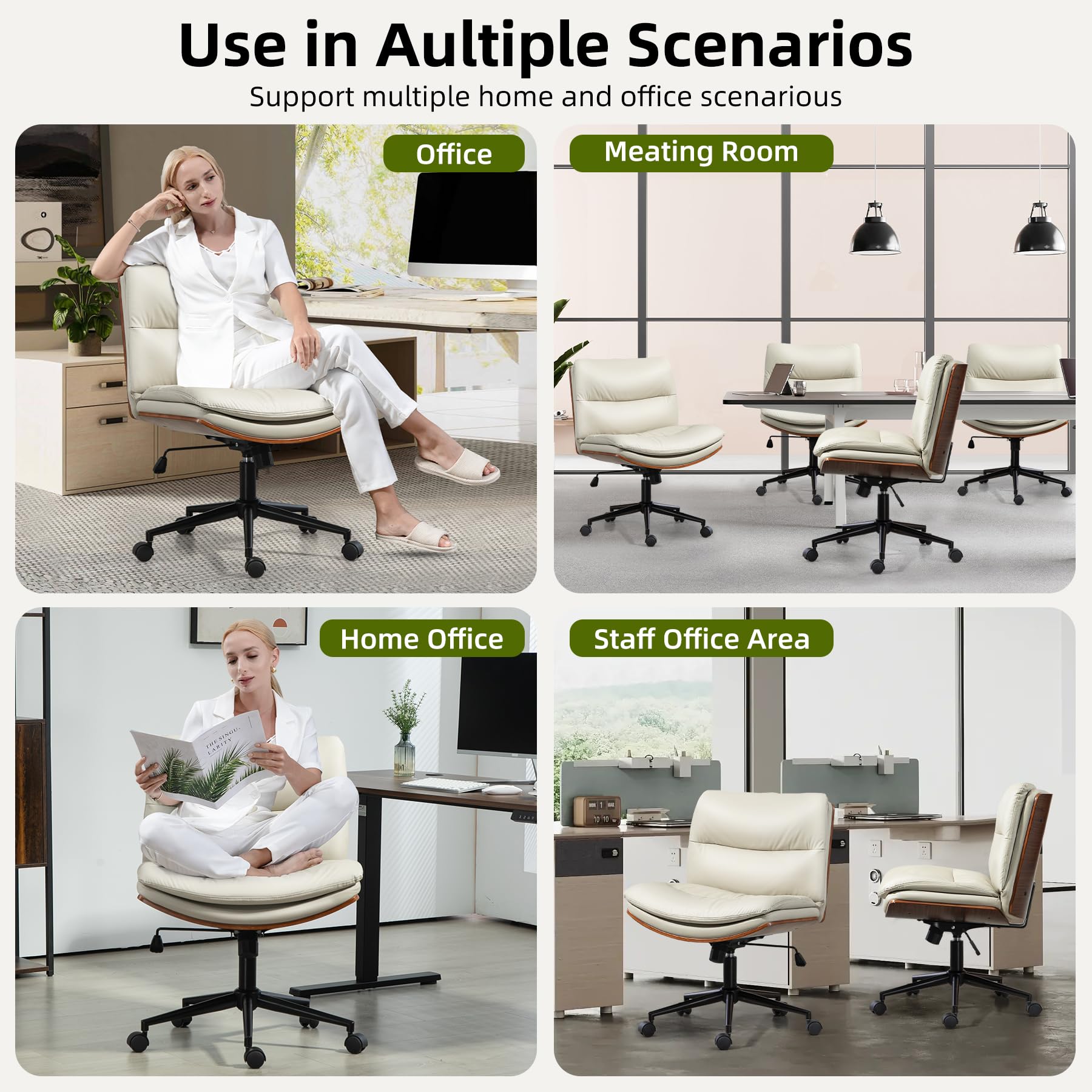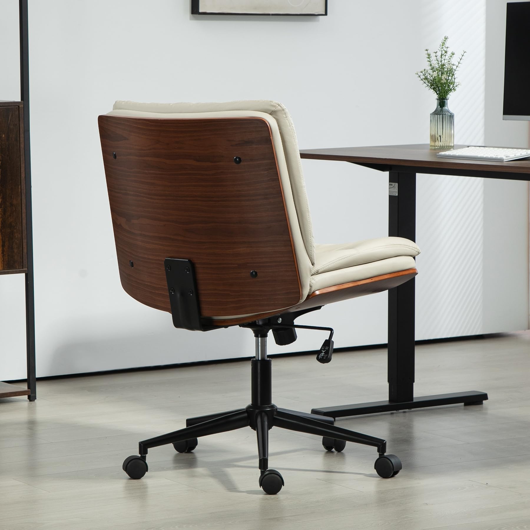 WQSLHX Office Chair, Criss Cross Legged Office Desk Chairs with Wheels, PU Leather Adjustable Swivel Walnut Task Chair with Wide Seat, Ergonomic Mid Back Computer Chair for Meeting Room, Home