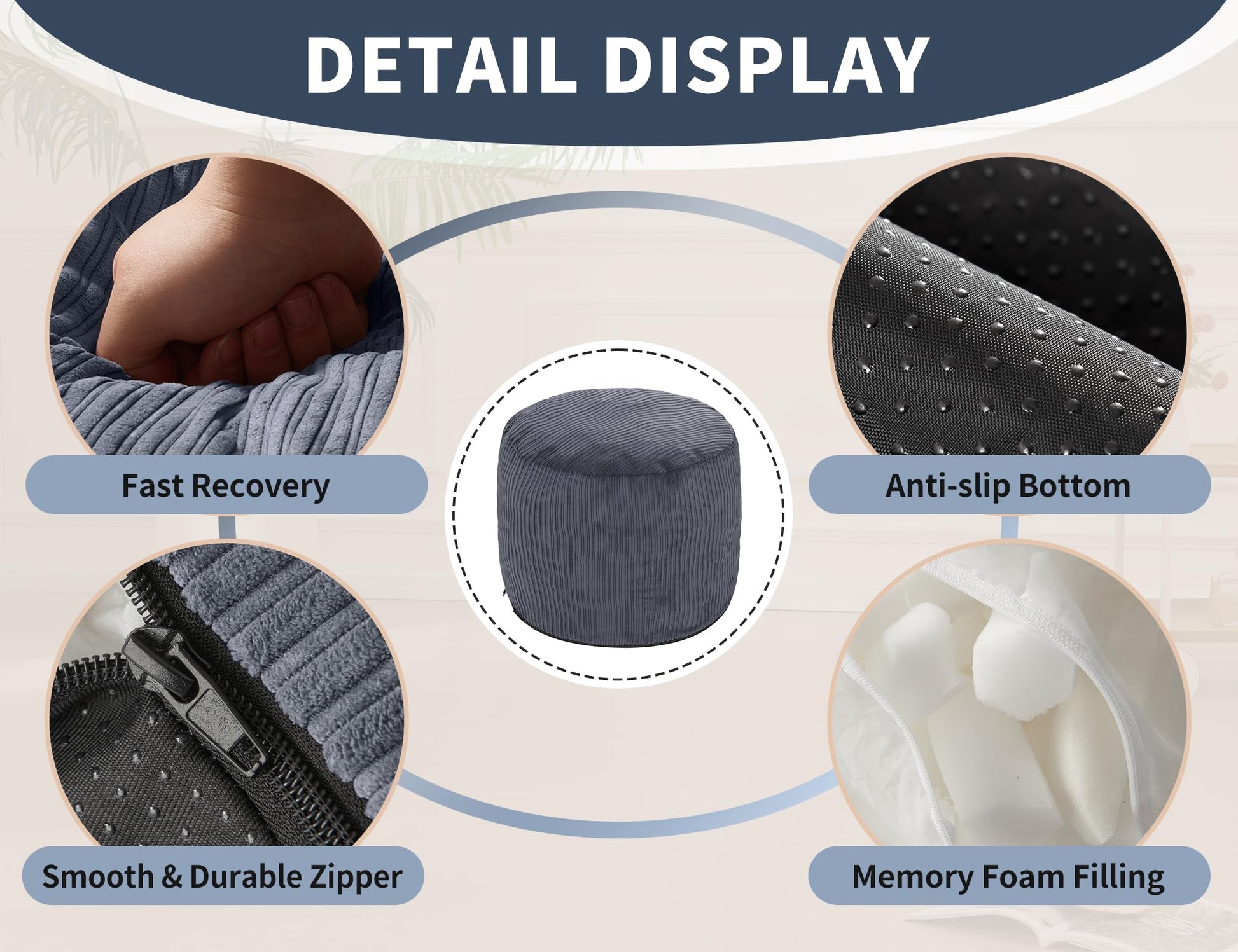 - Comfortable, Compact & Stylish foot ottoman: Made with soft, breathable corduroy and round ottoman cover filled with high-resilience foam, this footstool ottoman (20'x20'x15') offers both comfort and support. The footrest ottoman's compact size makes it perfect for small spaces, while bean bag ottoman's versatile design fits beautifully in living rooms, bedrooms, dorms, and kids' play areas.