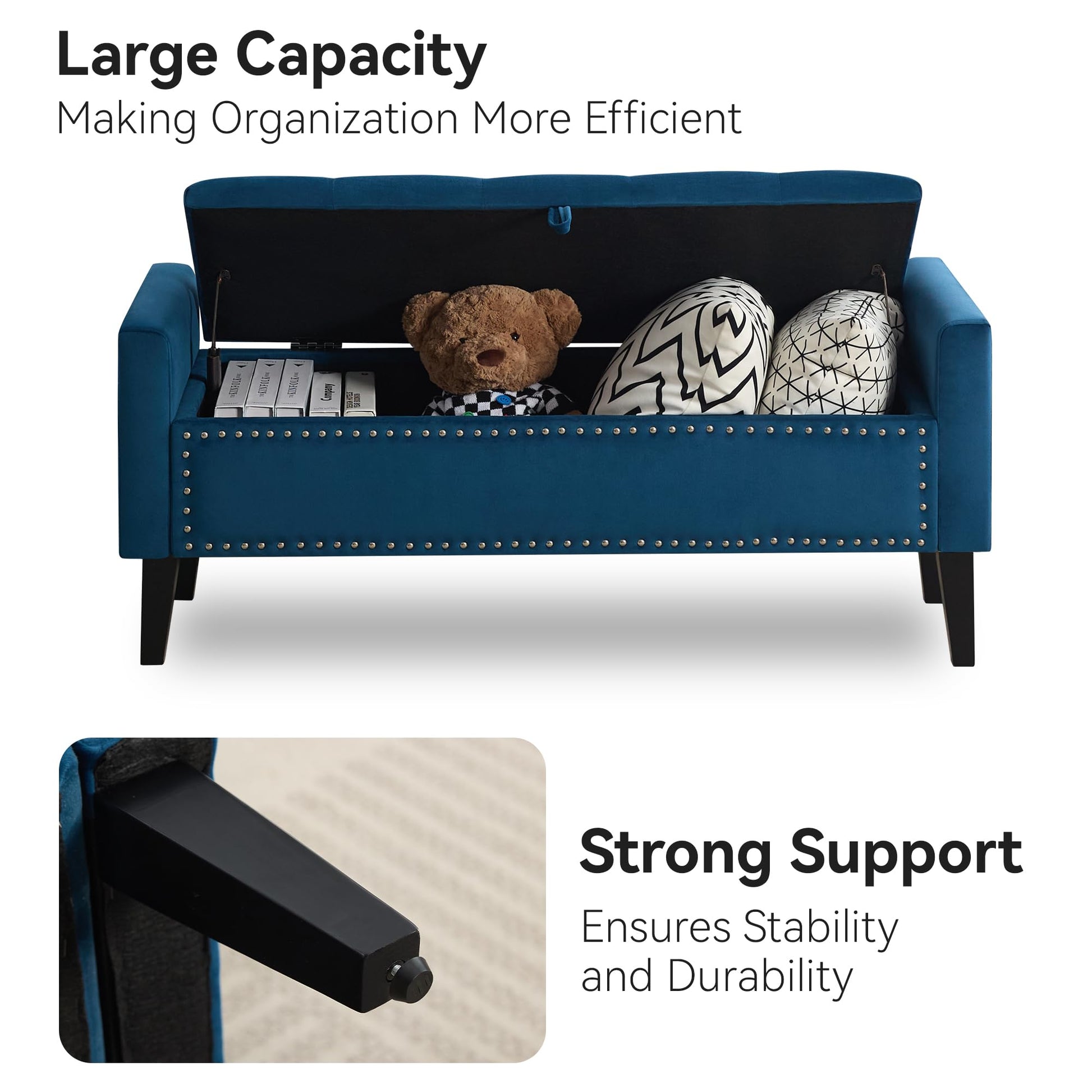 WUTUTUEE 47" Velvet Storage Bench, Upholstered Bed Bench with Storage, End of Bed Ottoman with Wooden Legs,Bedside Storage Bench for Bedroom, Living Room, or Entryway, Blue