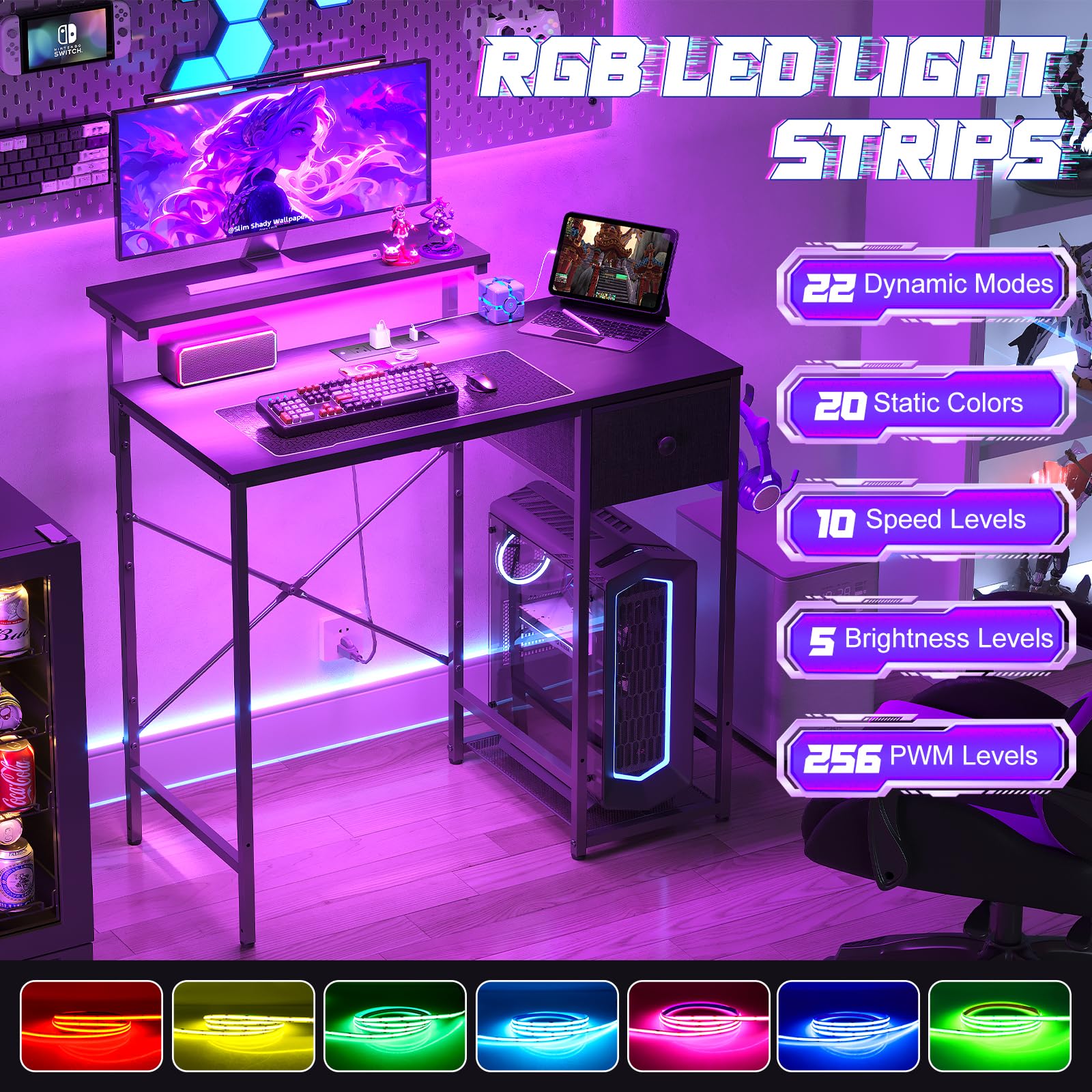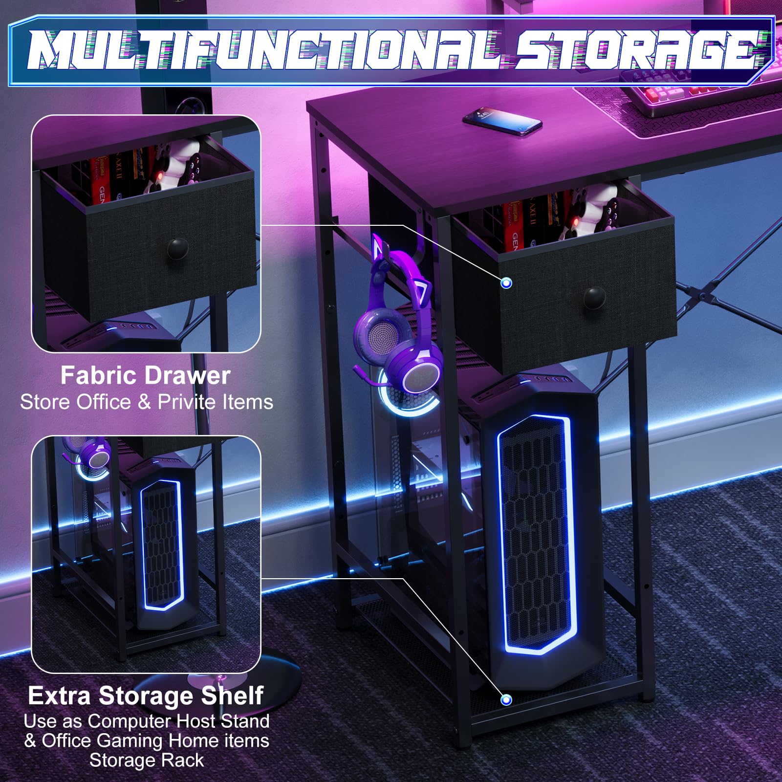 - [ All-in-One Compact Gaming Desk ]: 33.5 inch space-saving gaming desk integrates 6 essential features: ✅ Remote RGB LED lights (256 colors) ✅ 3-in-1 power hub (2 AC + USB/Type-C) ✅ Ergonomic monitor stand (used as monitor stand or storage shelf) ✅ Fabric storage drawer (hidden compartment) ✅ Reversible CPU stand (fits PC case, books) ✅ Headphone hooks. Perfect as a small desk for home office or gaming desk for bedroom corners.
