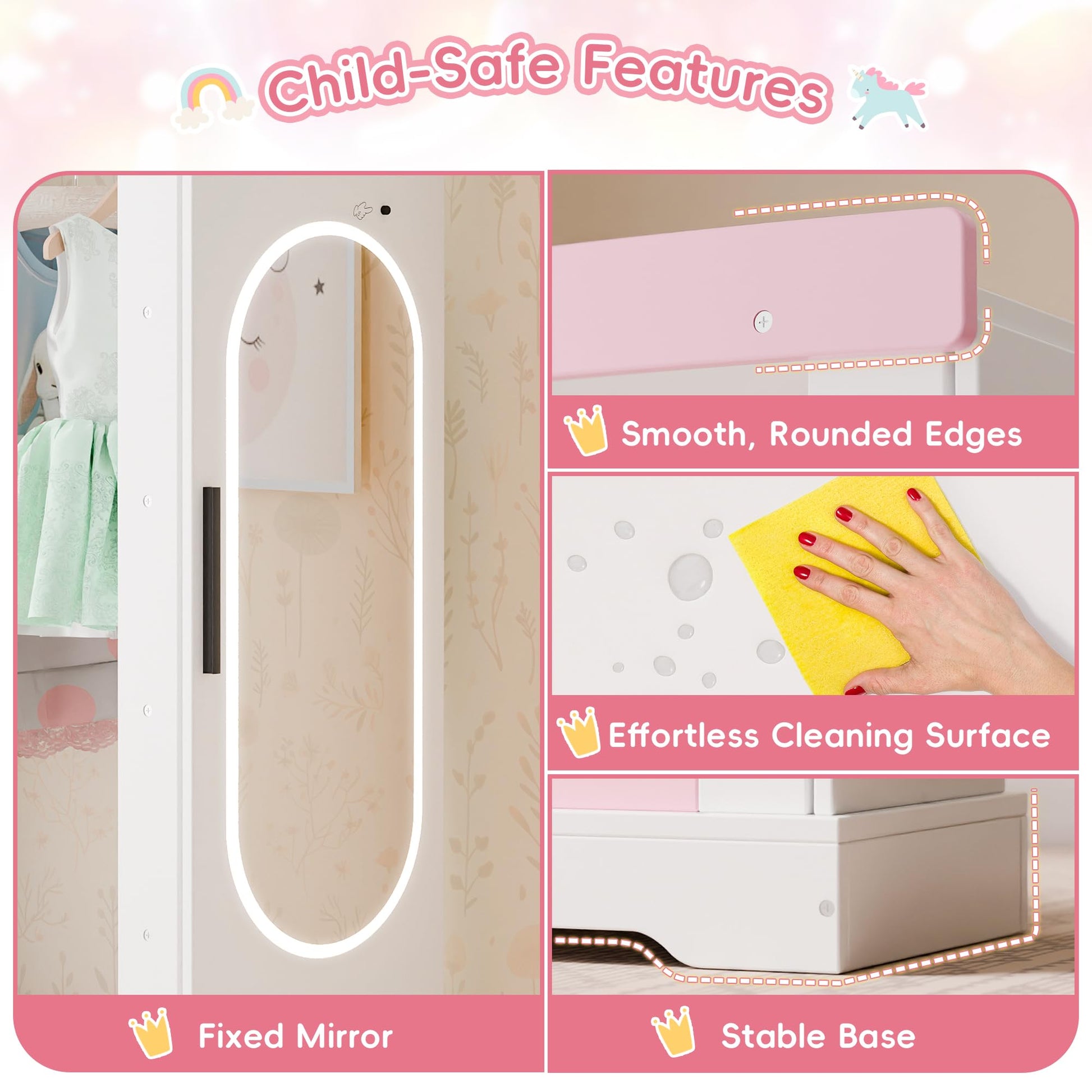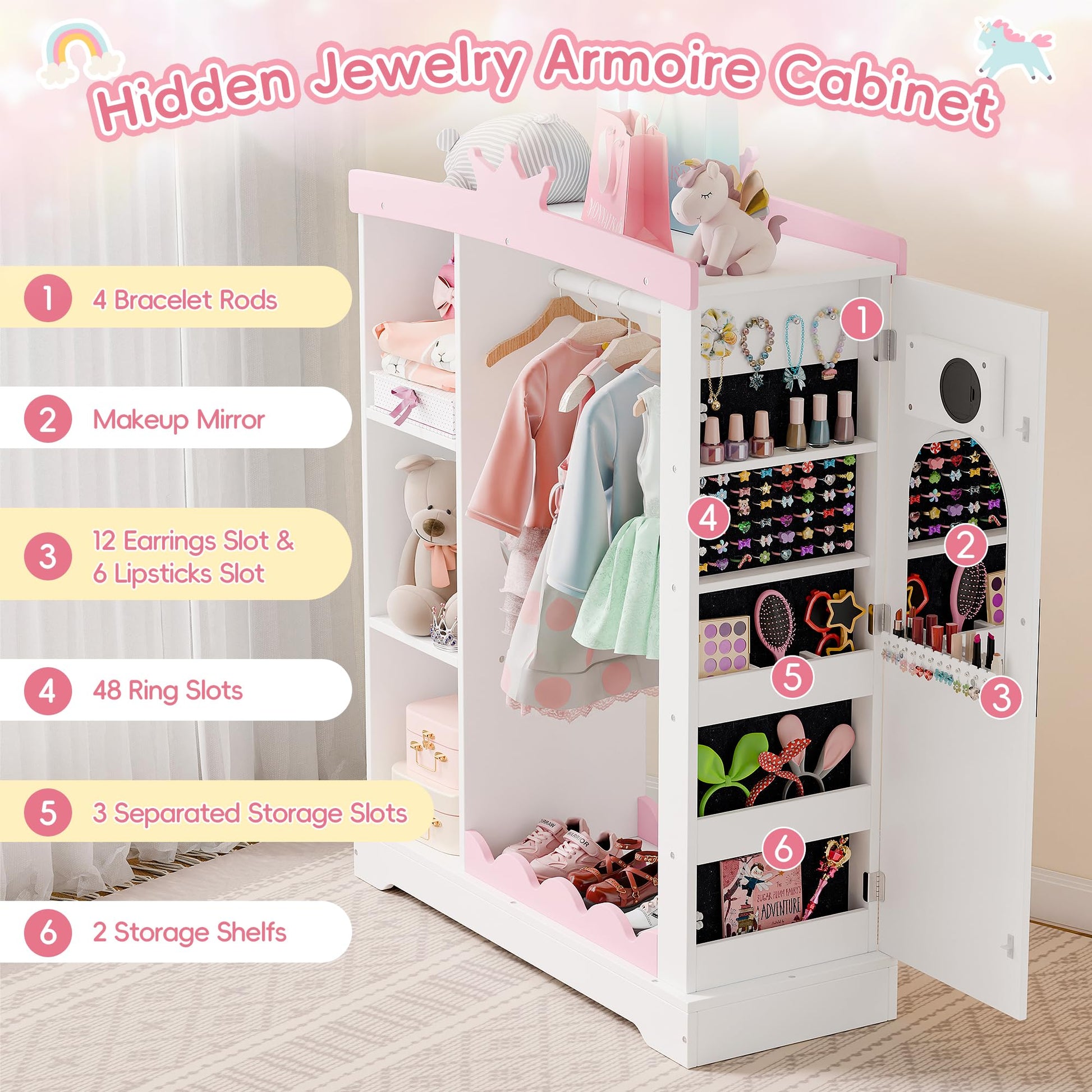 - 【HIDDEN JEWELRY CABINET DESIGN】A hidden jewelry cabinet is added to the side of the kid's wardrobe. This design makes it easy for your child to store everyday jewelry and playthings. It also saves you the hassle of buying another jewelry cabinet and saves space. The hidden design also makes this storage part more private and aesthetically pleasing.