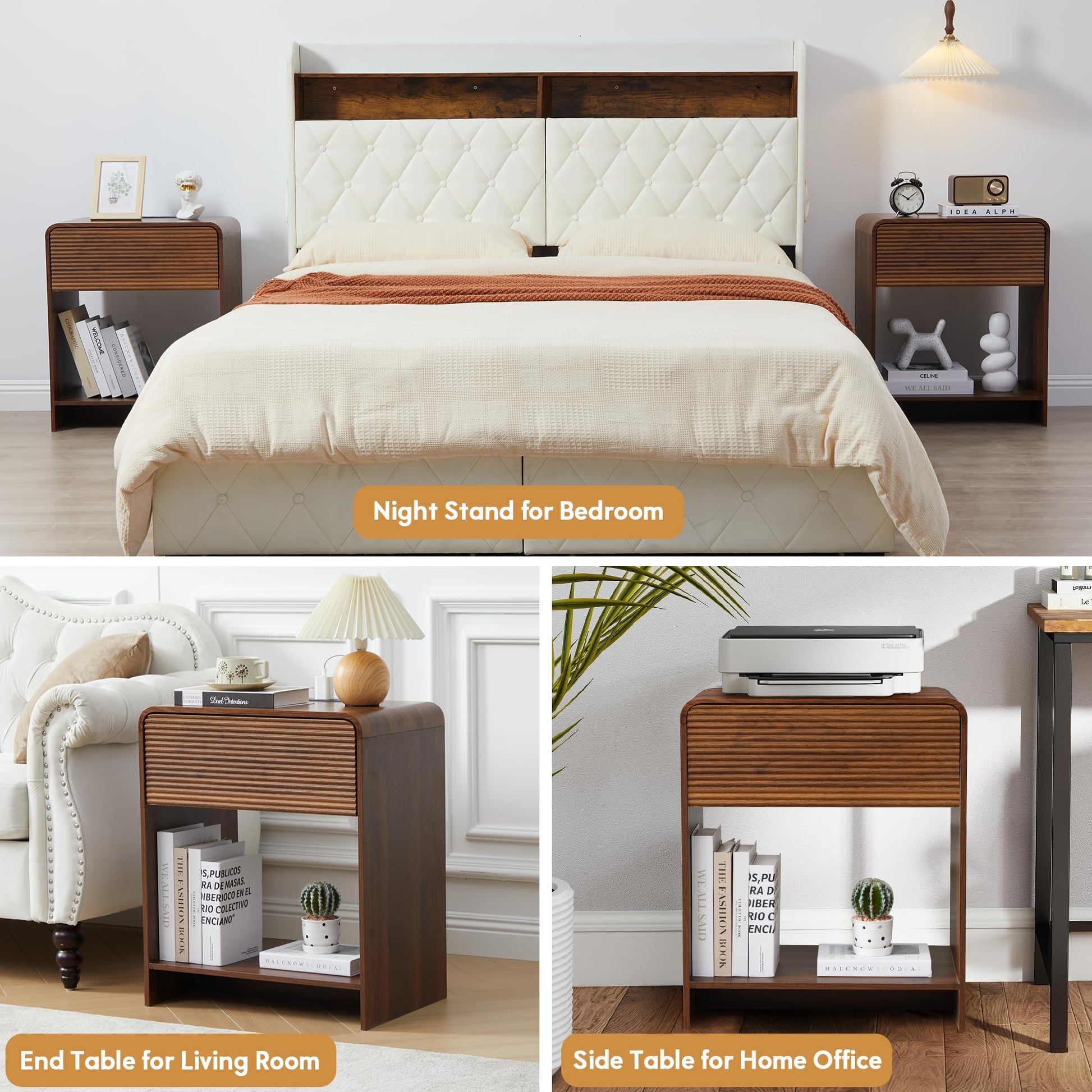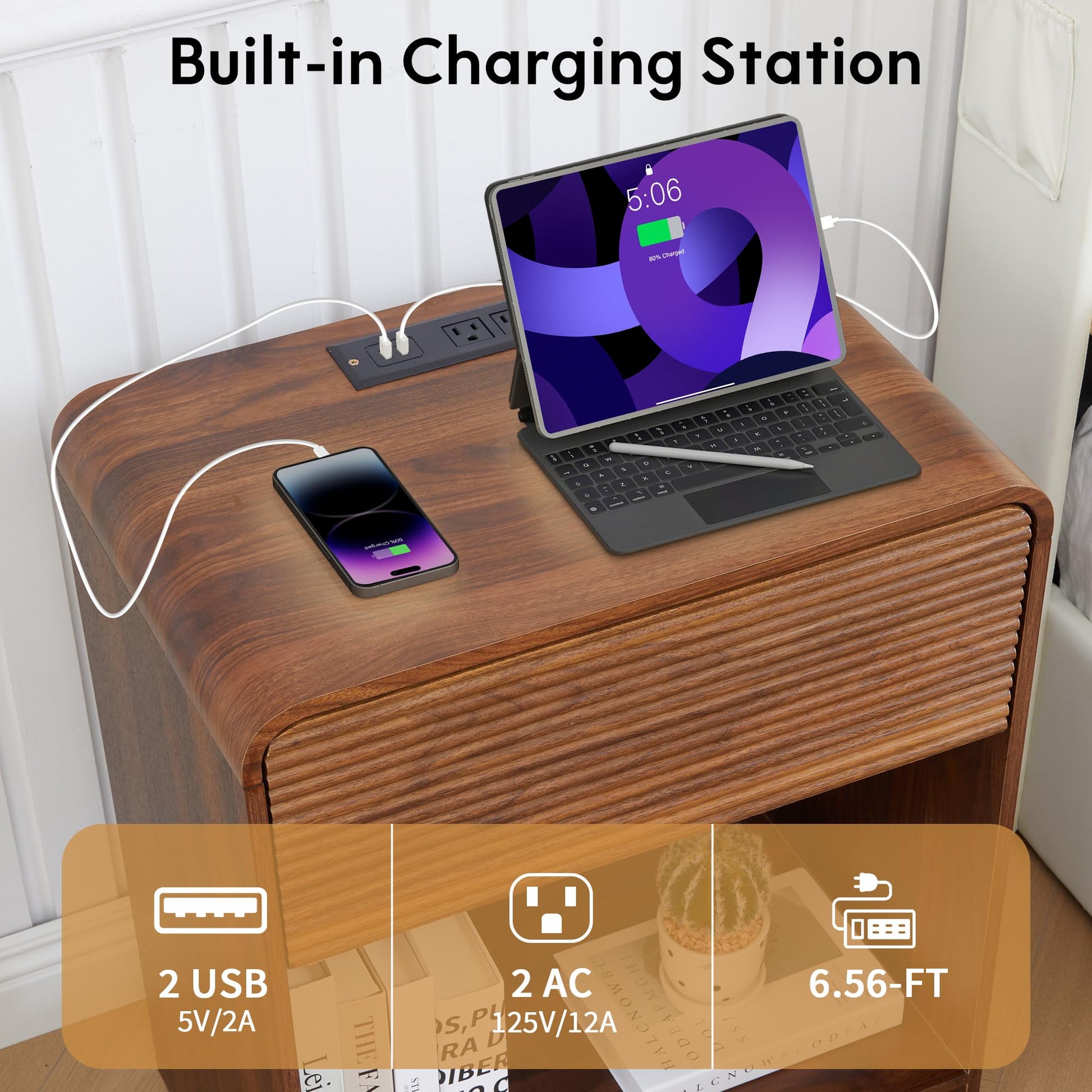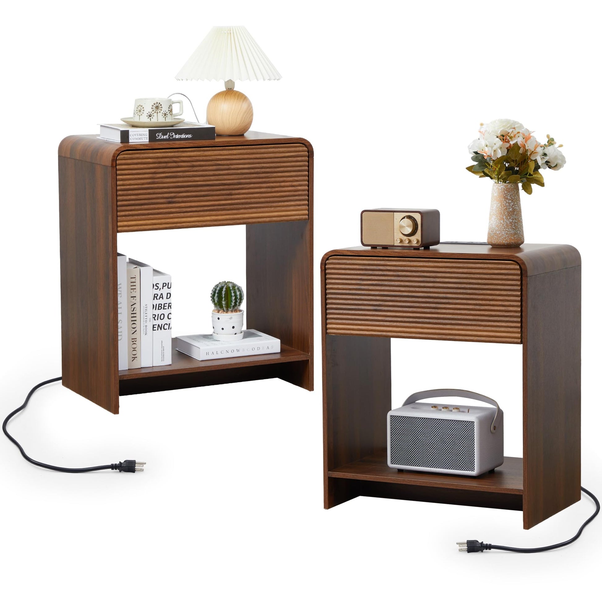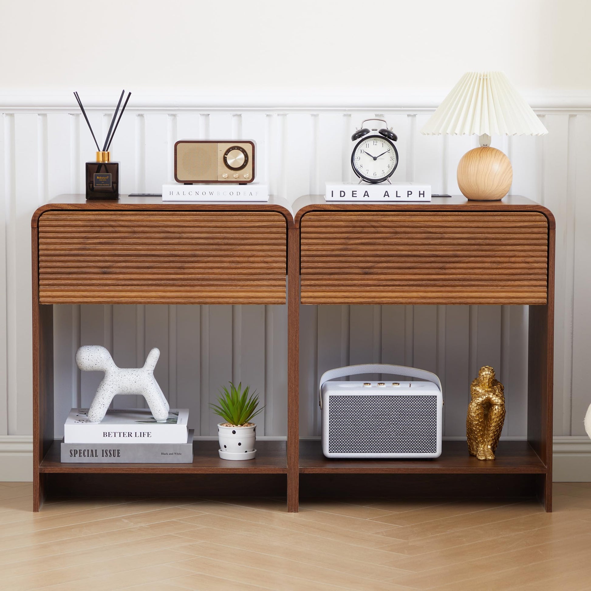 XUZENEST Fluted Nightstand Set of 2 with Charging Station, Modern Bed Side Table End Table with Drawer Storage, Large Wooden Night Stands Bedside for Bedroom Living Room Sofa Office, Walnut 2 Sets