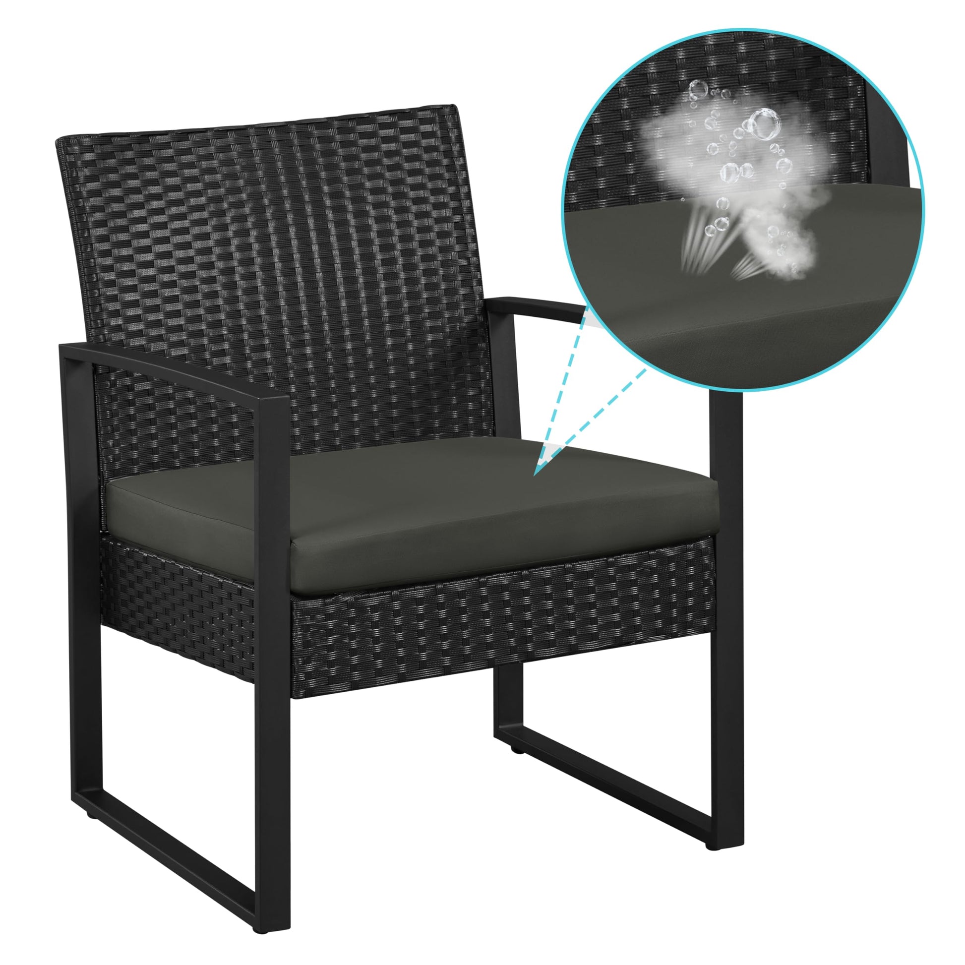 - Thick Cushions: This set comes with two thick cushions that enhance the comfort of the rattan chairs. Made with breathable 180g polyester and high-density foam, they’re soft, durable, and resistant to deformation. The removable covers are machine washable, wich is simple to refresh during seasons