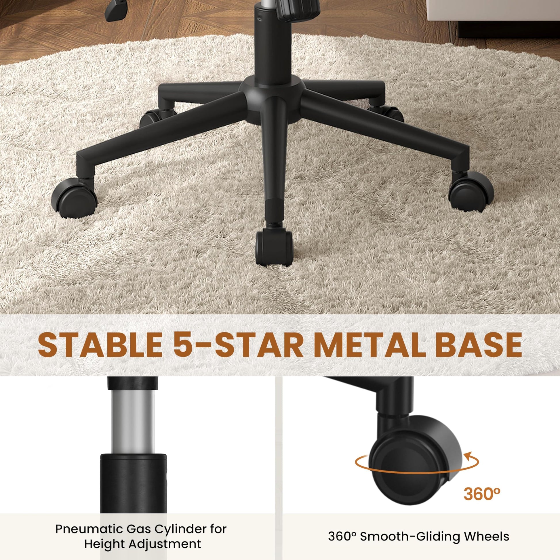 - Extra-Large Metal Base: This cross-legged office chair features a five-star iron base with a 25″ diameter, ensuring smooth 360-degree swivel and stability for various sitting positions. The black powder-coated surface resists everyday spills and scratches for a longer service life