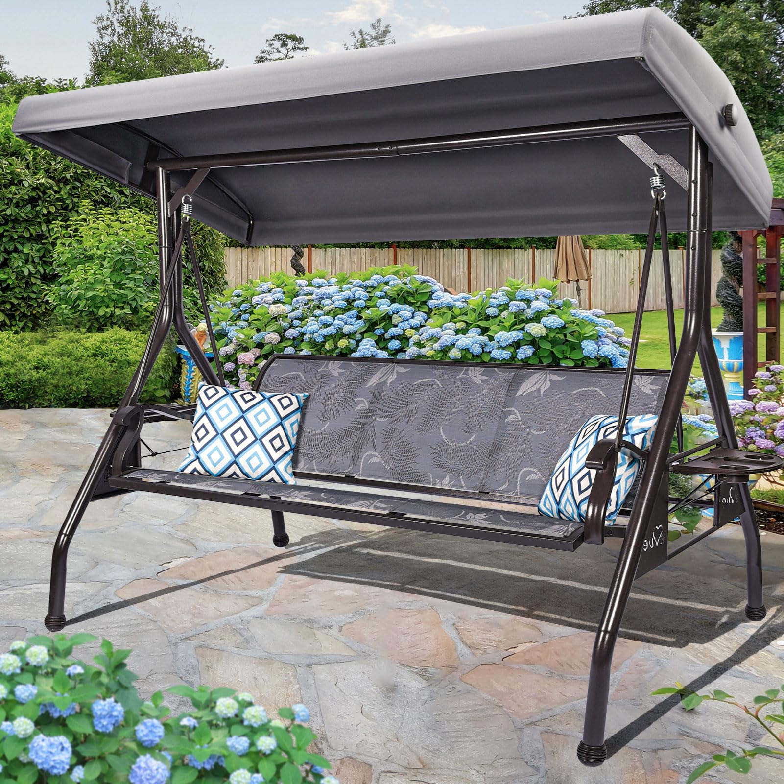ZZW 3 Person Patio Swing Outdoor Swing for Adults with Adjustable Canopy &Upgraded Cup Holders Textilene Fabric Porch Swing Chair with Stand Heavy Duty 800 LBS