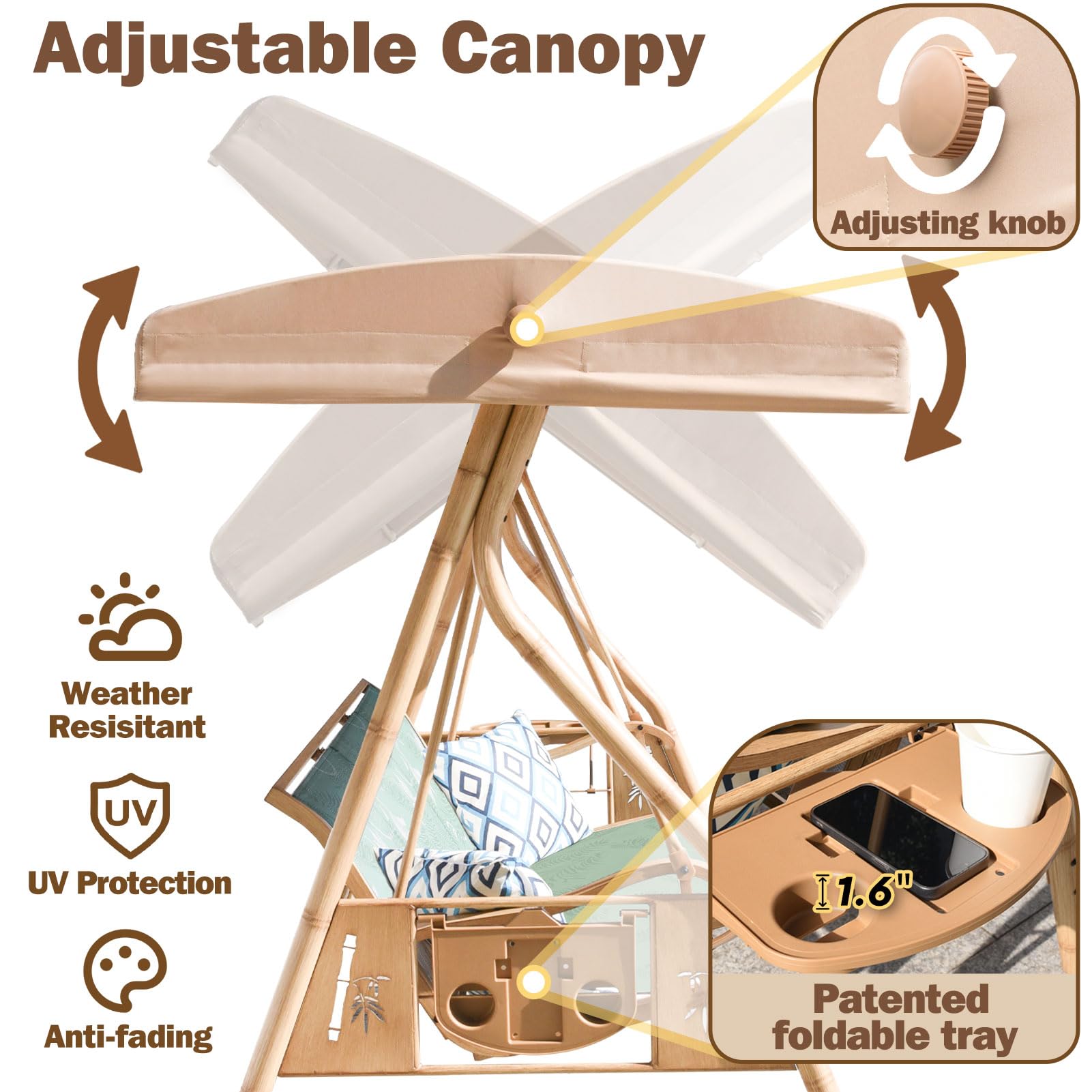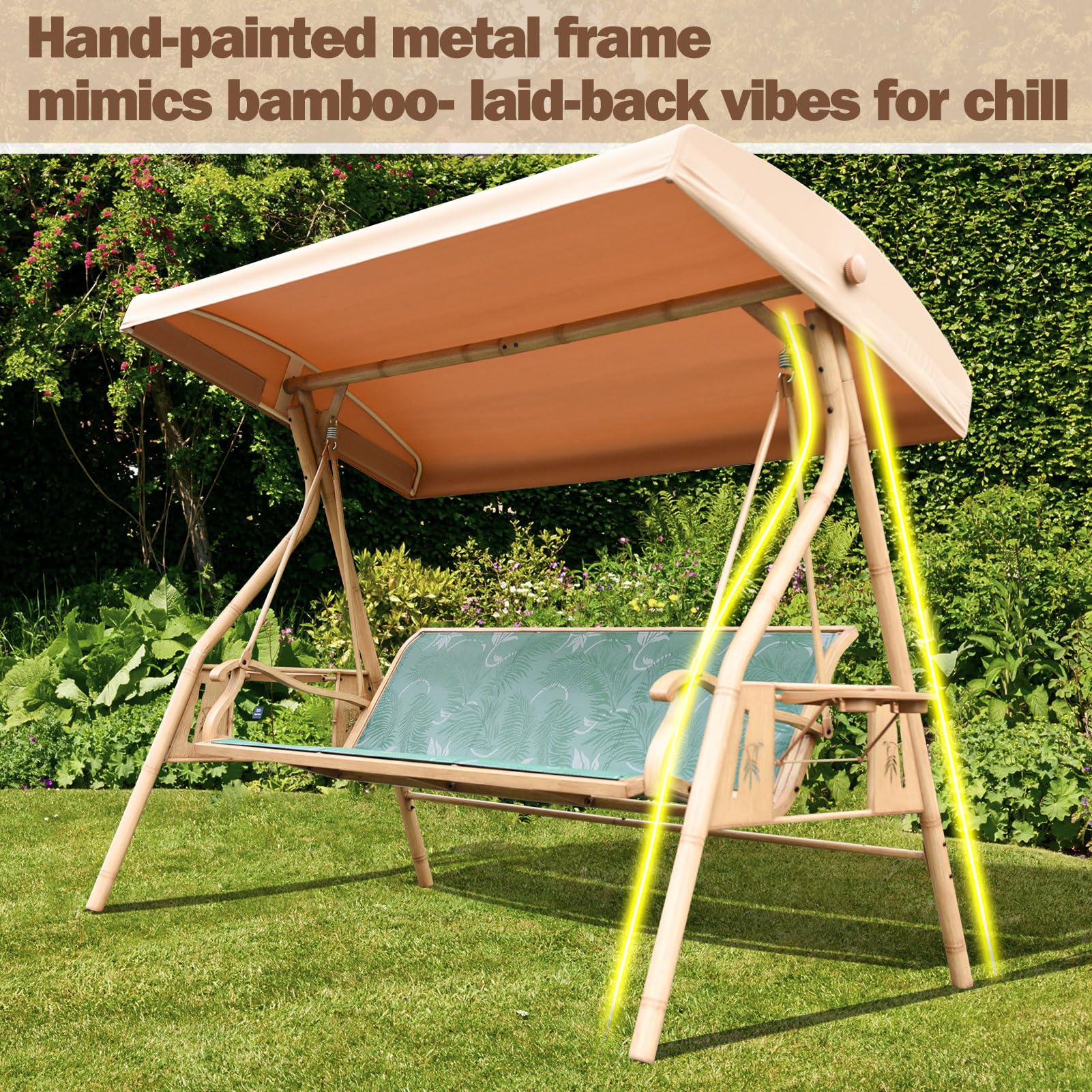 ZZW 3 Person Patio Swing Outdoor Swing for Adults with Adjustable Canopy &Upgraded Cup Holders Textilene Fabric Porch Swing Chair with Stand Heavy Duty 800 LBS